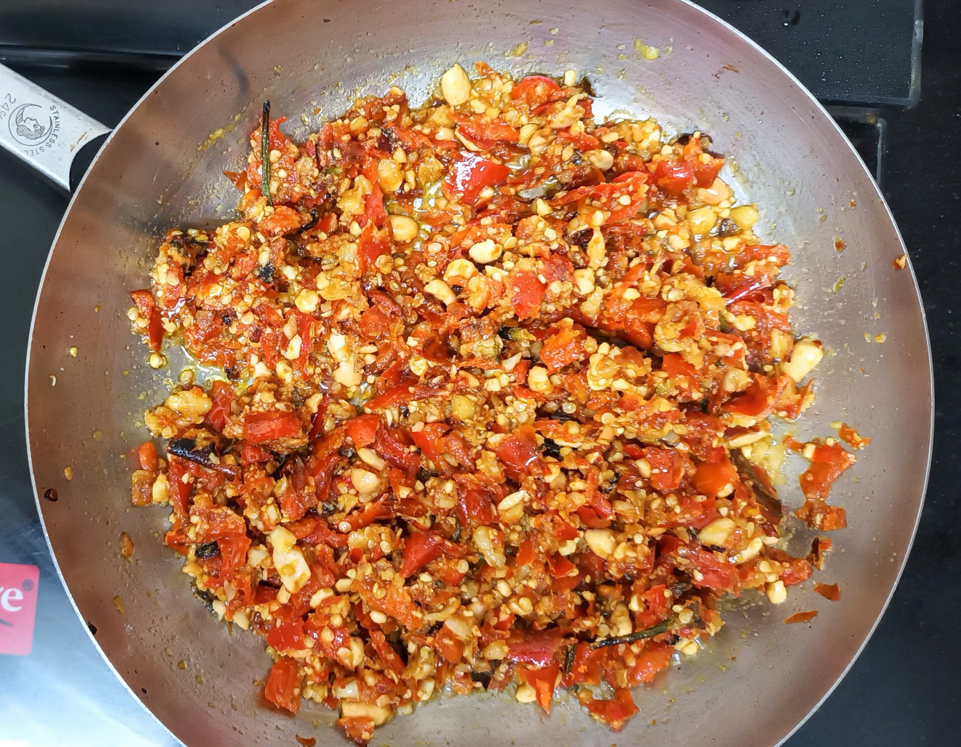 To a pan add 1/4 cup Sesame oil and heat. Now add the chillies/red peppers a few at a time and fry them until blisters appear on them. While frying the oil splutters a lot. To avoid this you can cover the pan partially with a plate. Once fried, remove the chillies onto a plate and cool them. Now add another 1/4 cup oil to the same pan and heat. Now add the minced garlic and fry it well in oil. Do this over a low flame. When the garlic turns light brown, turn off the flame. Now add the fried chillies to a mincer and mince to a grainy/coarse paste. If you don’t have a mincer, this can be done in your blender jar, using the pulse mode. Now add this coarse Red chilli paste to the garlic, and turn on the flame again. Add another 1/4 cup oil, and continue to fry for 2 minutes, over a low flame. Now add turmeric powder, Salt, crushed Peanut, and fry well. Now a the ACV( apple cider Vinegar), followed by the jaggery powder, and continue to fry until the oil starts separating from the mixture. Now put off the flame, and add the chopped coriander leaves. Mix well, and let it cool down. Transfer to an airtight container and store it in the fridge for up to 15 days. This Chutney goes well with Rotis, Paratha, Dosa, Uthappam, and Rice.