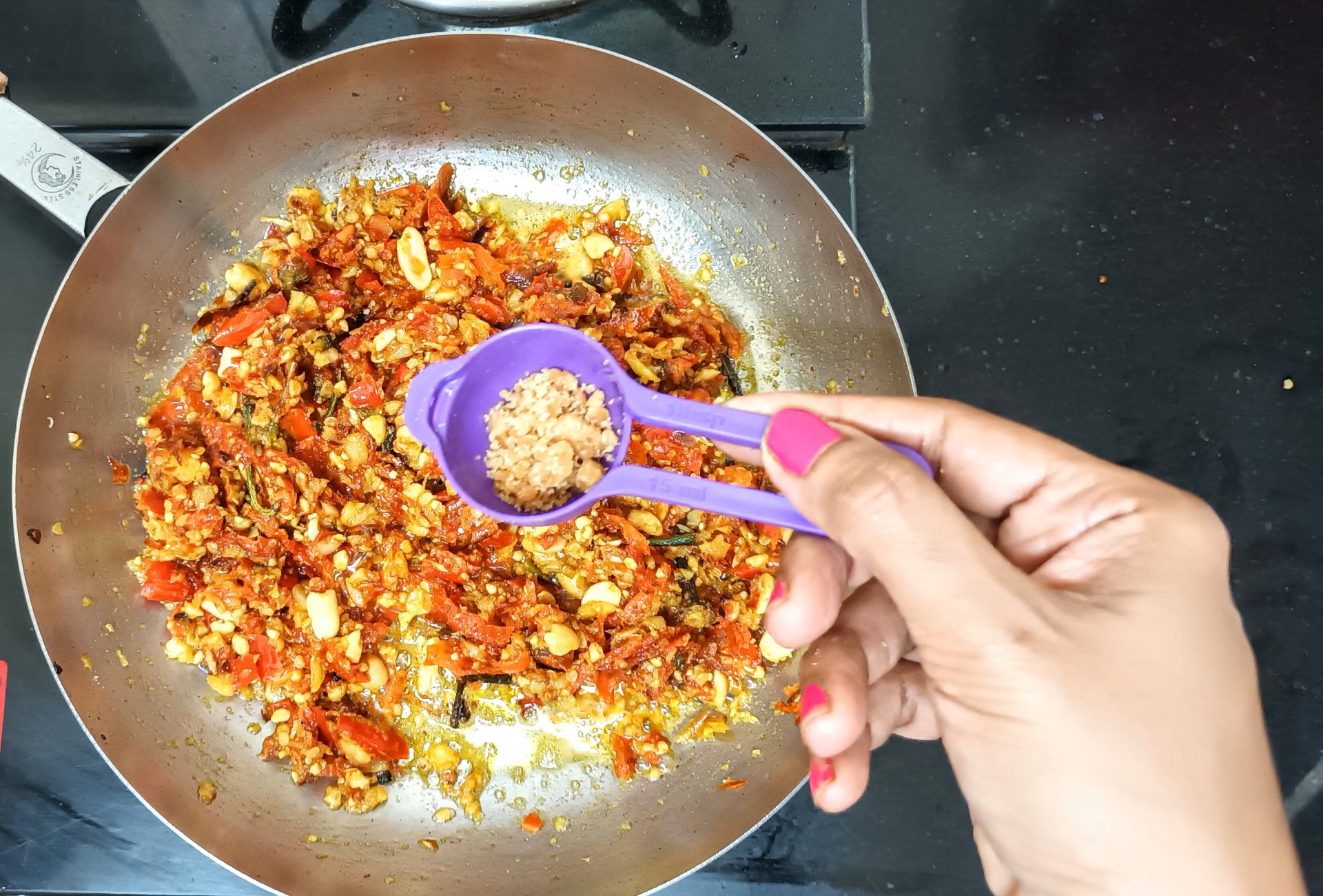 - Now add turmeric powder, Salt, crushed Peanut, and fry well. Now a the ACV( apple cider Vinegar), followed by the jaggery powder, and continue to fry until the oil starts separating from the mixture. Now put off the flame, and add the chopped coriander leaves. Mix well, and let it cool down. Transfer to an airtight container and store it in the fridge for up to 15 days. This Chutney goes well with Rotis, Paratha, Dosa, Uthappam, and Rice.