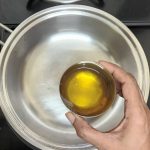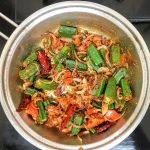 - In a pan/karahi heat some Til oil(preferably, if not continue with refined oil). Add mustard seeds, fenugreek seeds, dry red chillies, asafoetida, curry leaves, and fry until the mustard seeds crackle. Add the chopped Okra/Ladyfinger, and stir well so that the oil coats all the Bhindi/Okra. Fry for a minute or two.