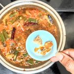 Usually when I cook this for my North Indian friends, I get asked what is the difference between Sambar and Vatha Kuzhambu. So, I thought I must clarify that here, as many of you might also have the same query, if you aren’t familiar with south Indian food. In Sambar, cooked dal is added, whereas Vatha Kuzhambu is devoid of any Dal. Also, the stage at which the Sambar powder is added, makes all the difference to the taste of the Kuzhambu/curry. The vegetables or berries used are sauted in oil along with the Sambar powder for making Vatha Kuzhambu, whereas in Sambar, the vegetables are directly cooked in tamarind water, without sauteing. The consistency of the two also varies. While sambar is on the thinner side, Vatha Kuzhambu is a thick curry.