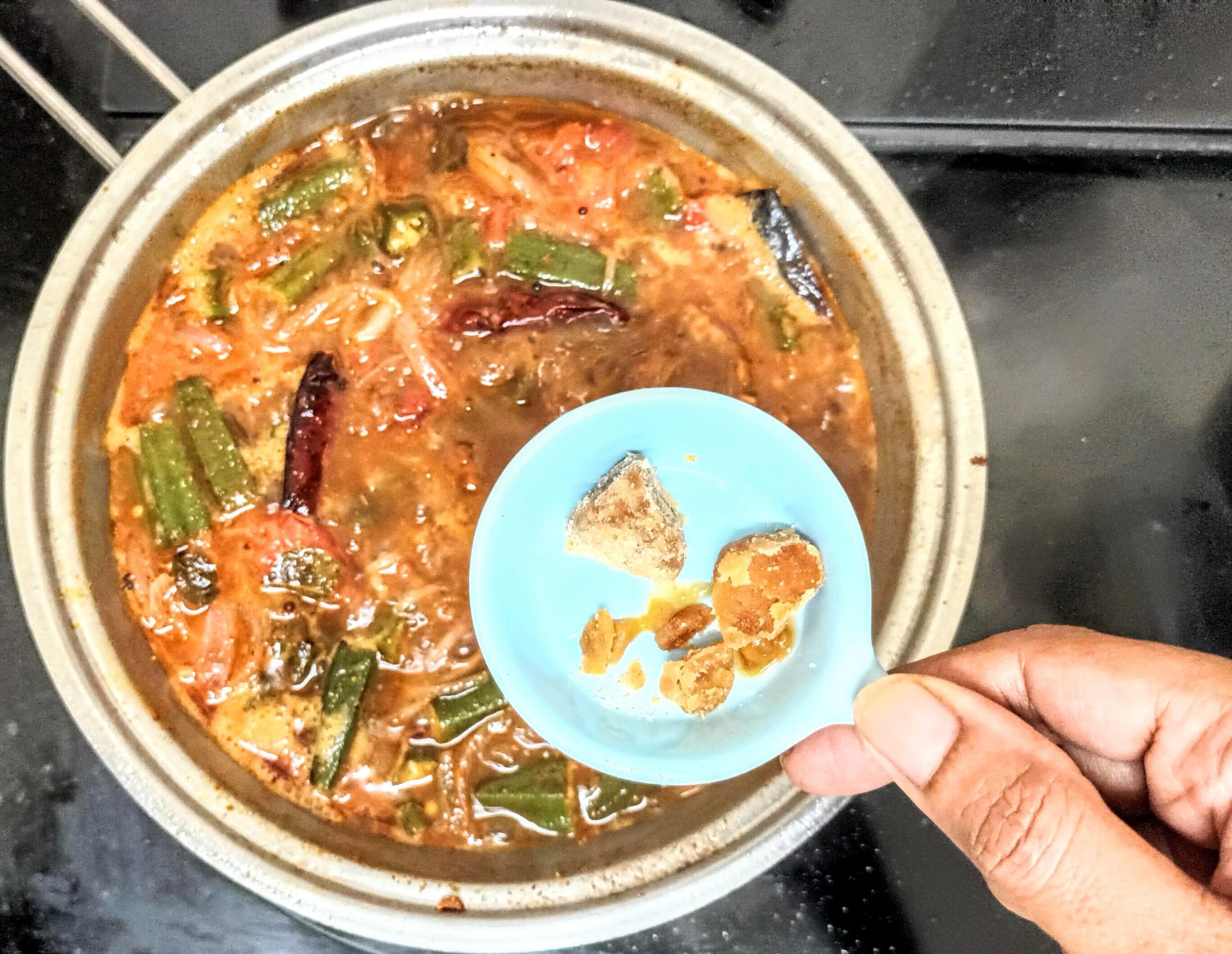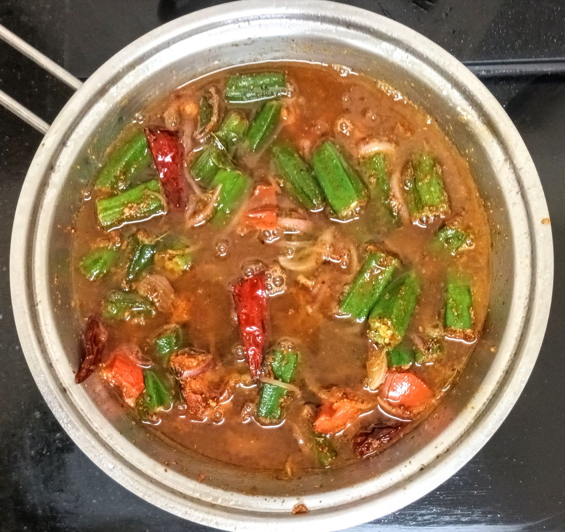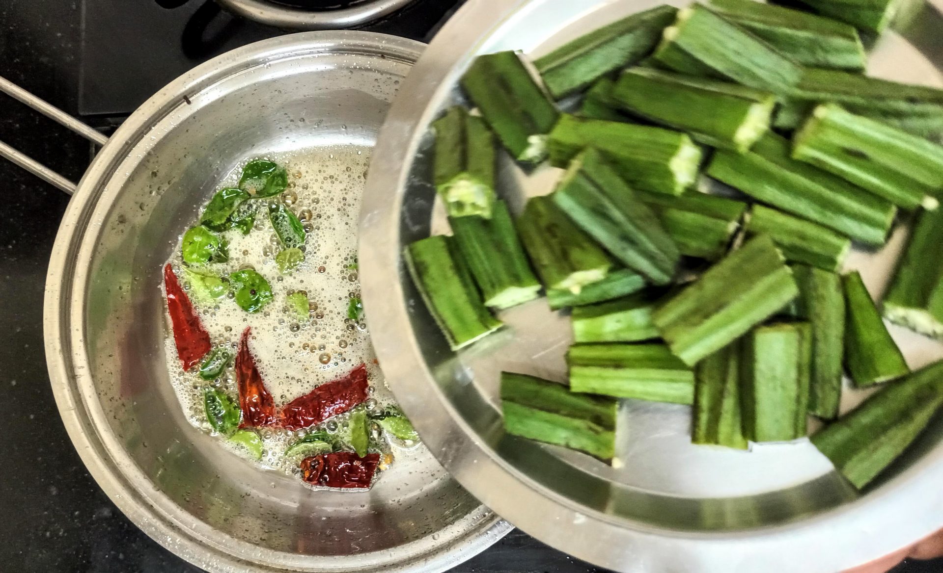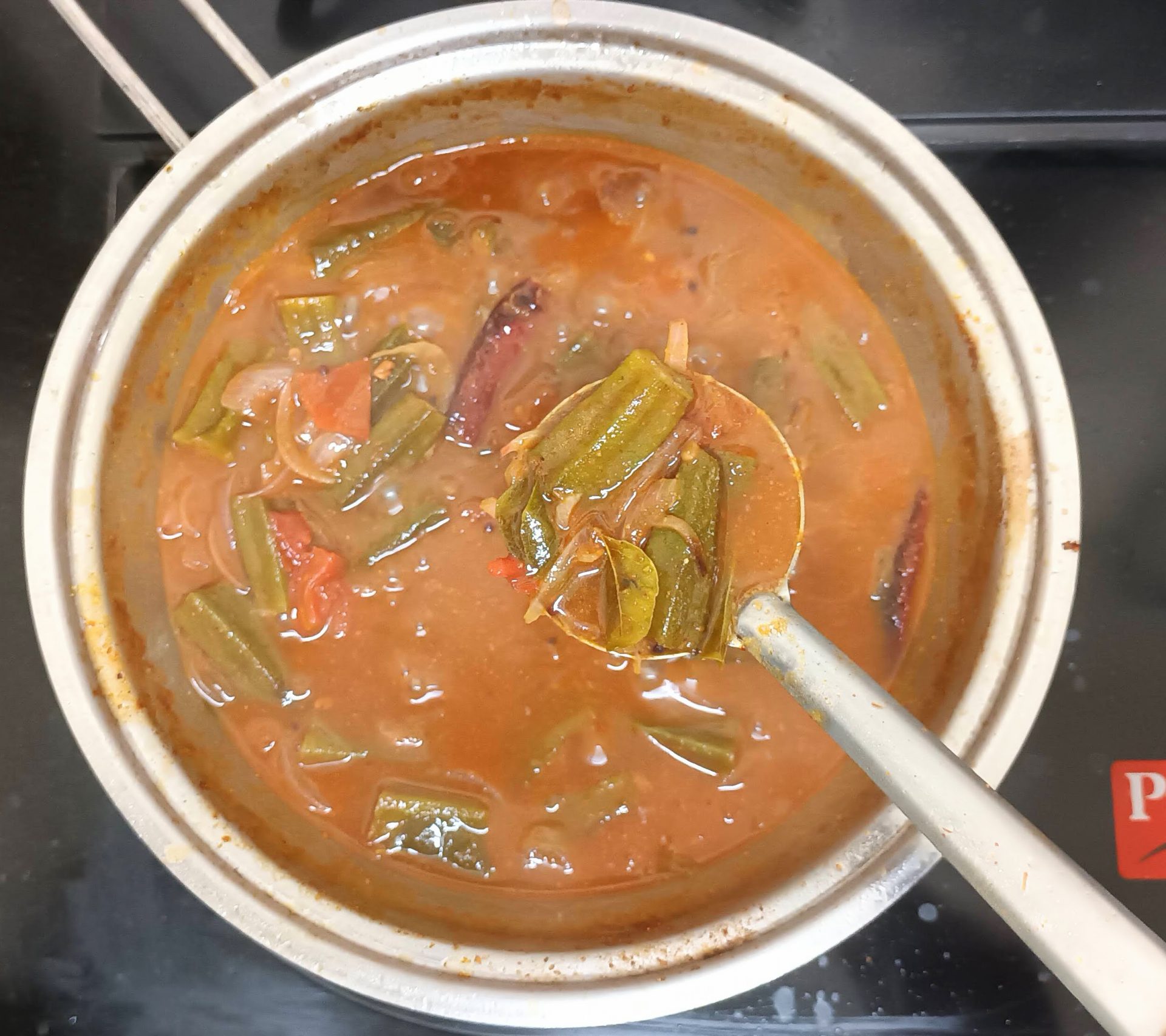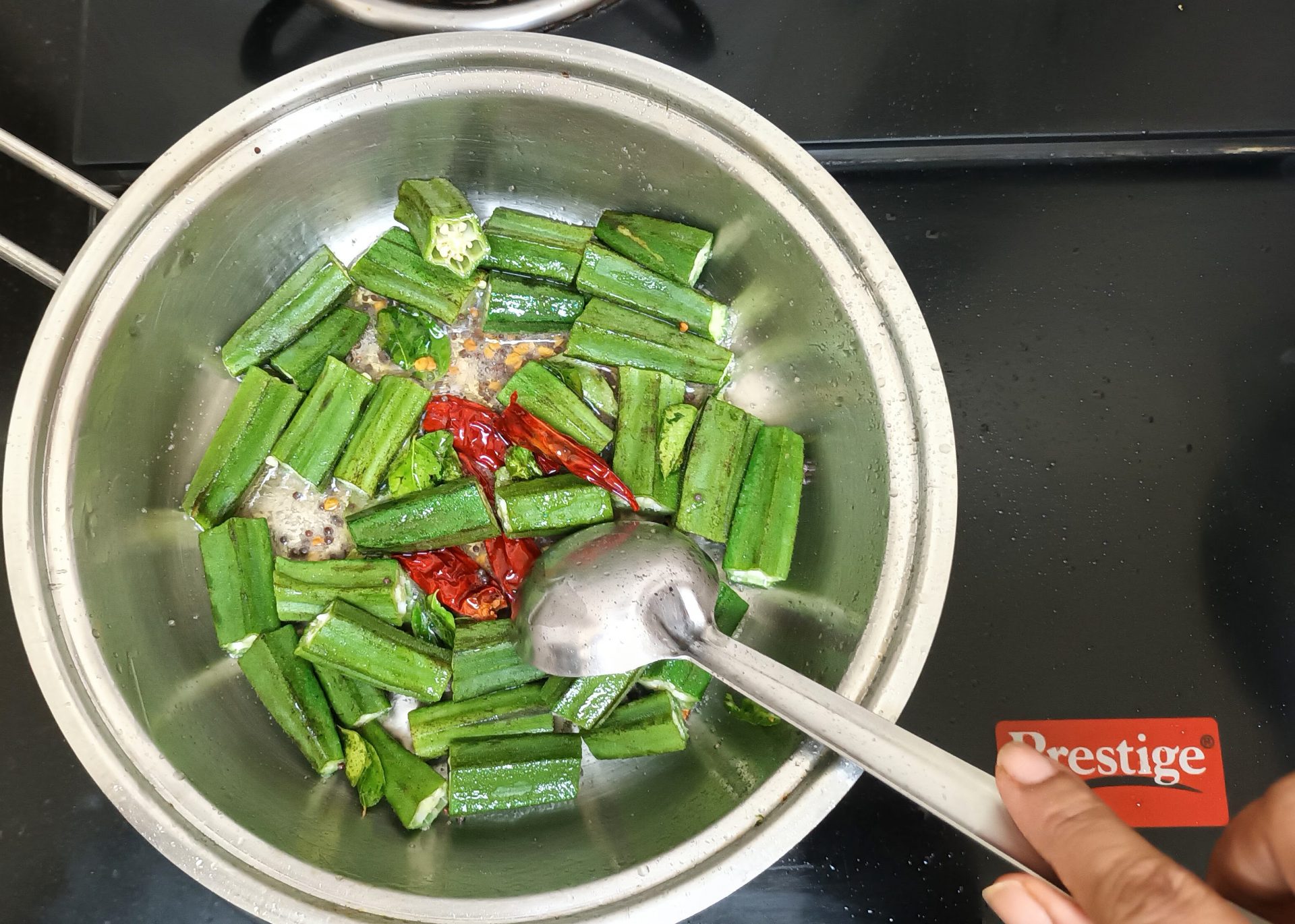 - I have used Okra/Ladysfinger here, other vegetables that can be used are Drumsticks, Shallots, Onions, dehydrated berries like Turkey berry(Sundakai), and even dehydrated vegetables like Cluster beans, Bitter gourd, etc.