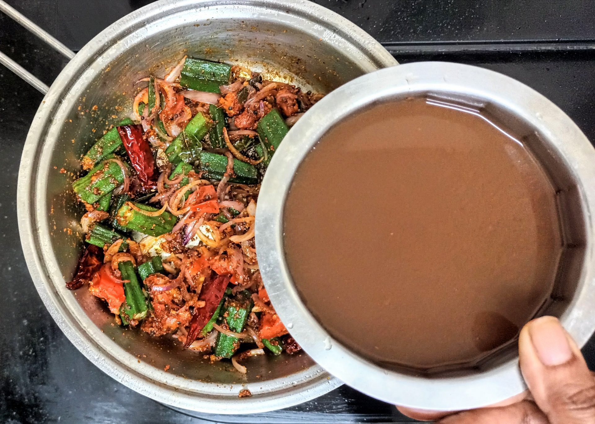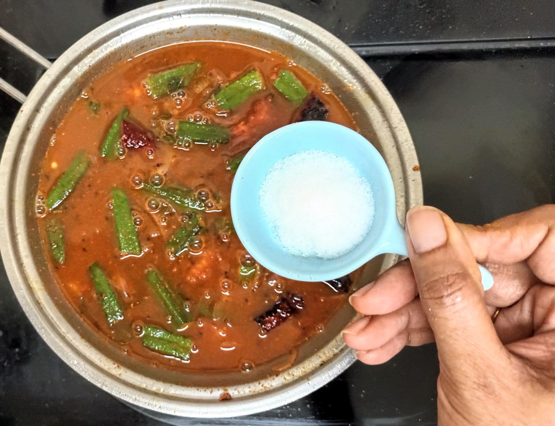 - Now add the Tamarind pulp followed by salt and let it boil. Once the mixture comes to a boil, add little jaggery and continue to cook until the gravy reduces to a curry consistency. Check for salt and spices and add accordingly. I have not added red chilli powder, as the Sambar powder is spicy enough. The Vendakai Vatha Kuzhambu is ready to serve.