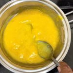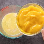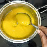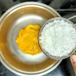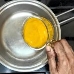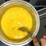To a pan add the Mango puree and the icing sugar, and mix to dissolve the sugar. Now turn on the flame and cook the puree for 5 minutes on medium heat, sitting continuously. The mixture should be smooth and lump free. Set aside and allow to cool.