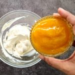 2. Now take the Cream Cheese(at room temperature) in a bowl and whip it to a smooth texture using a spatula(beater not necessary). When it turns creamy, add the cooked and cooled Mango pulp and fold lightly, until well combined. Put it in the refrigerator until further use.