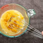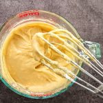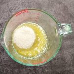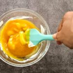 1. Melt the butter and let it cool down(alternatively put in the microwave for 30 seconds). Take the melted and cooled butter in a mixing bowl. To this add the sugar and cream well using a spatula. Now add the condensed milk, followed by  3/4 cup Mango puree . Now using a wire whisk combine well.