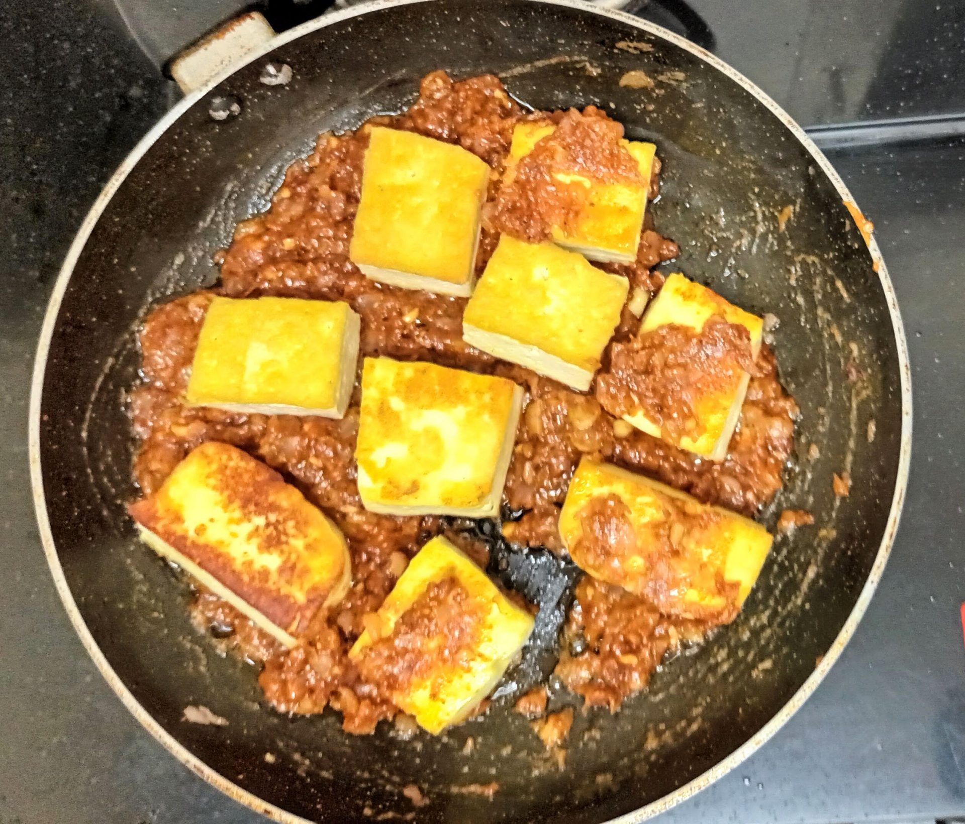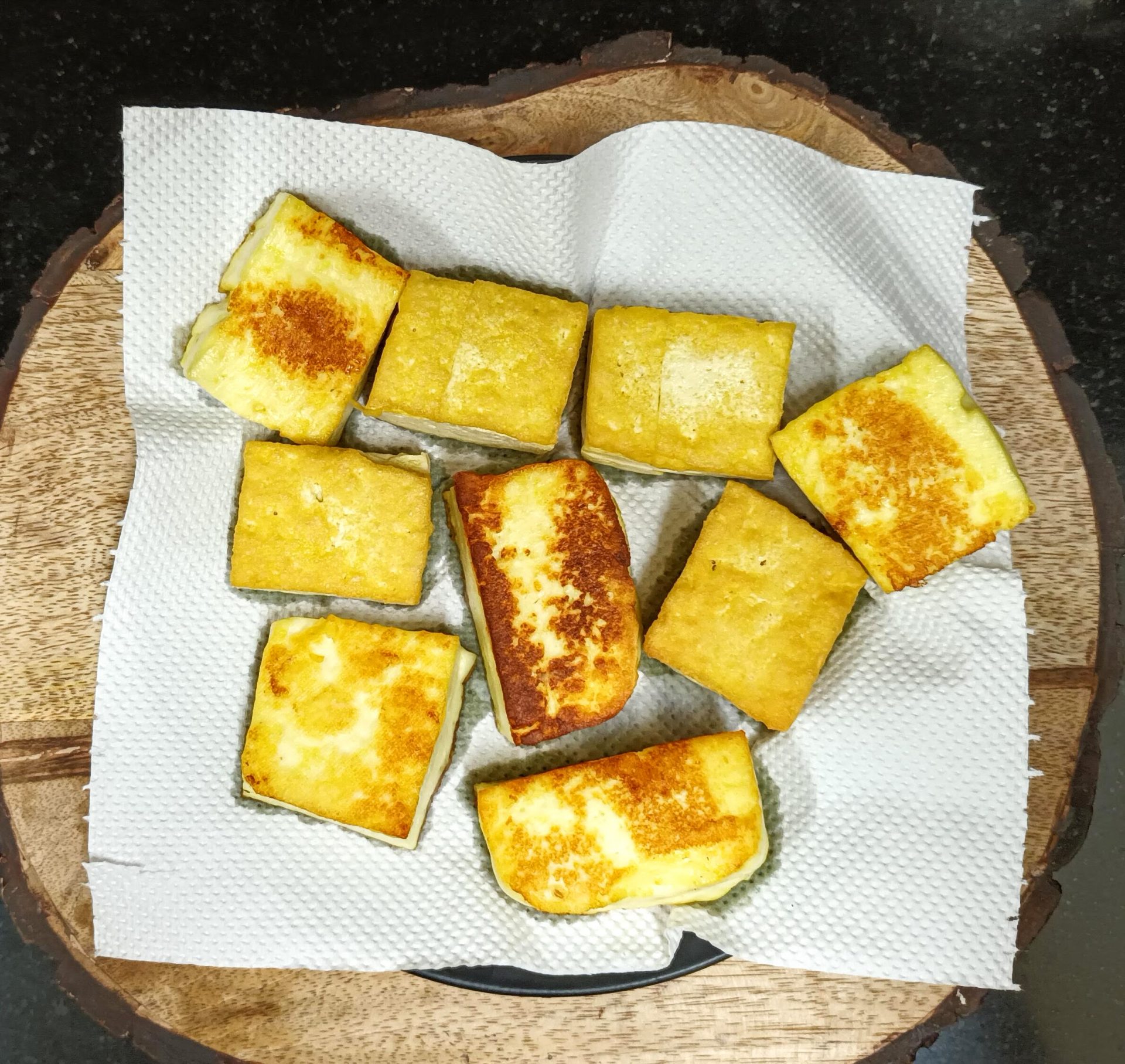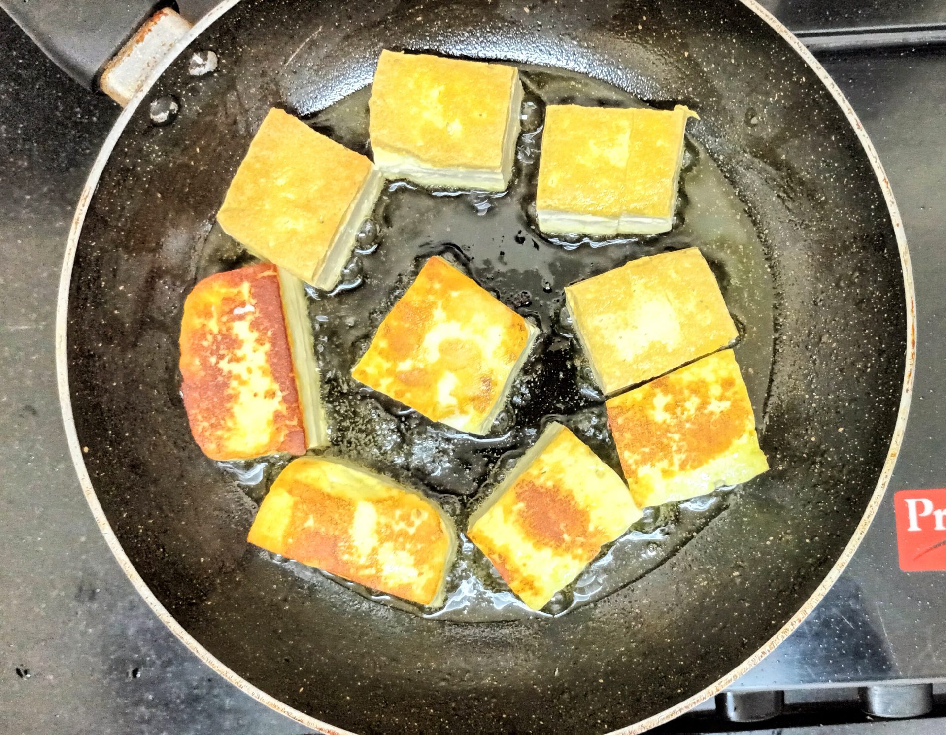 1. Remove the Tofu block from the packing, rinse in water, and use paper towels to dab the excess moisture away. I wrap it up in paper towels for 10 minutes, before I start. Now cut the Tofu into cubes (I cut a block into 4 cubes), and pan fry in Sesame oil until golden. Drain on absorbent paper.