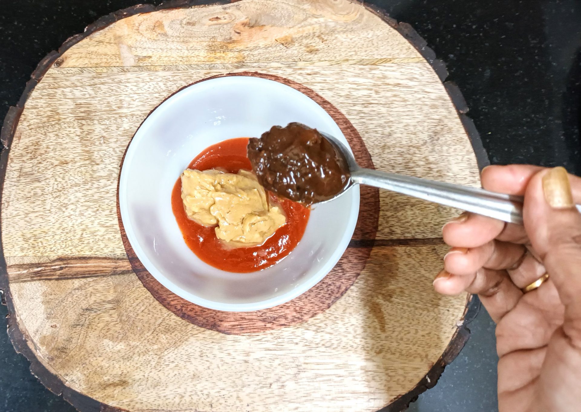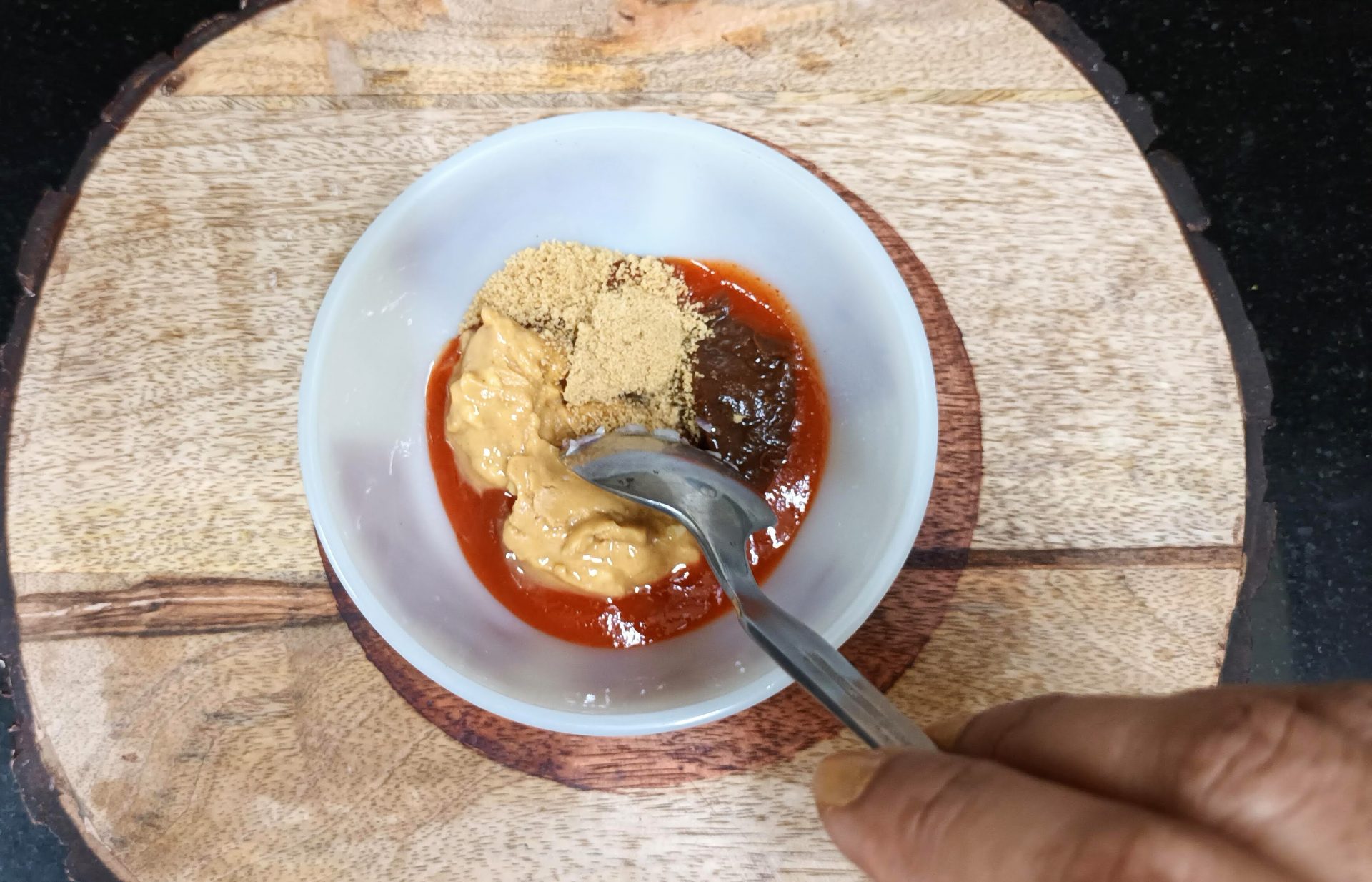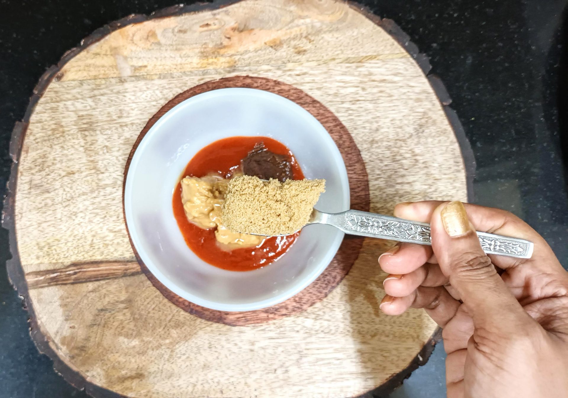 3. Next, to a bowl add the red chilli sauce, peanut butter, brown sugar, tamarind paste, and mix every thing well. Set this Sambol paste aside until further use.