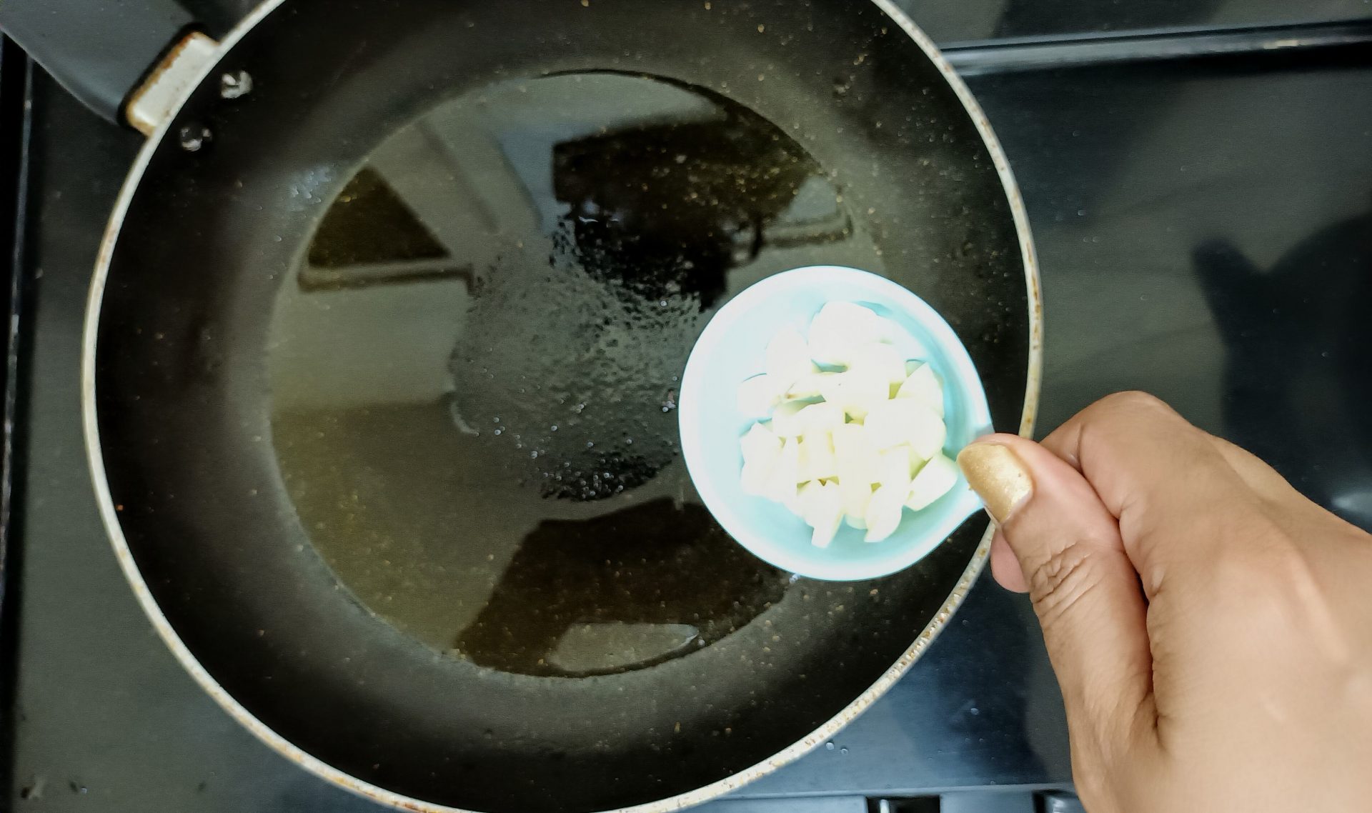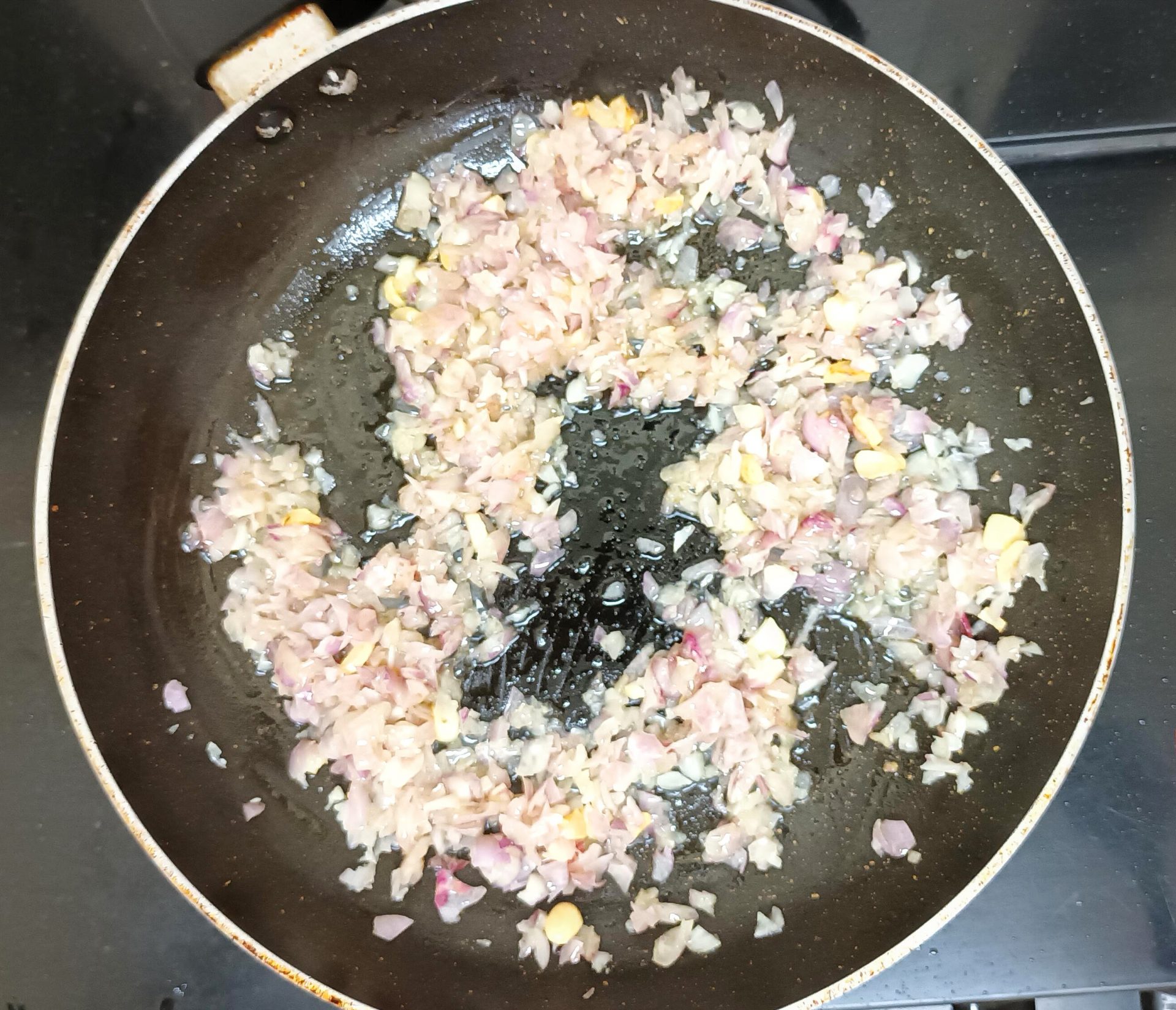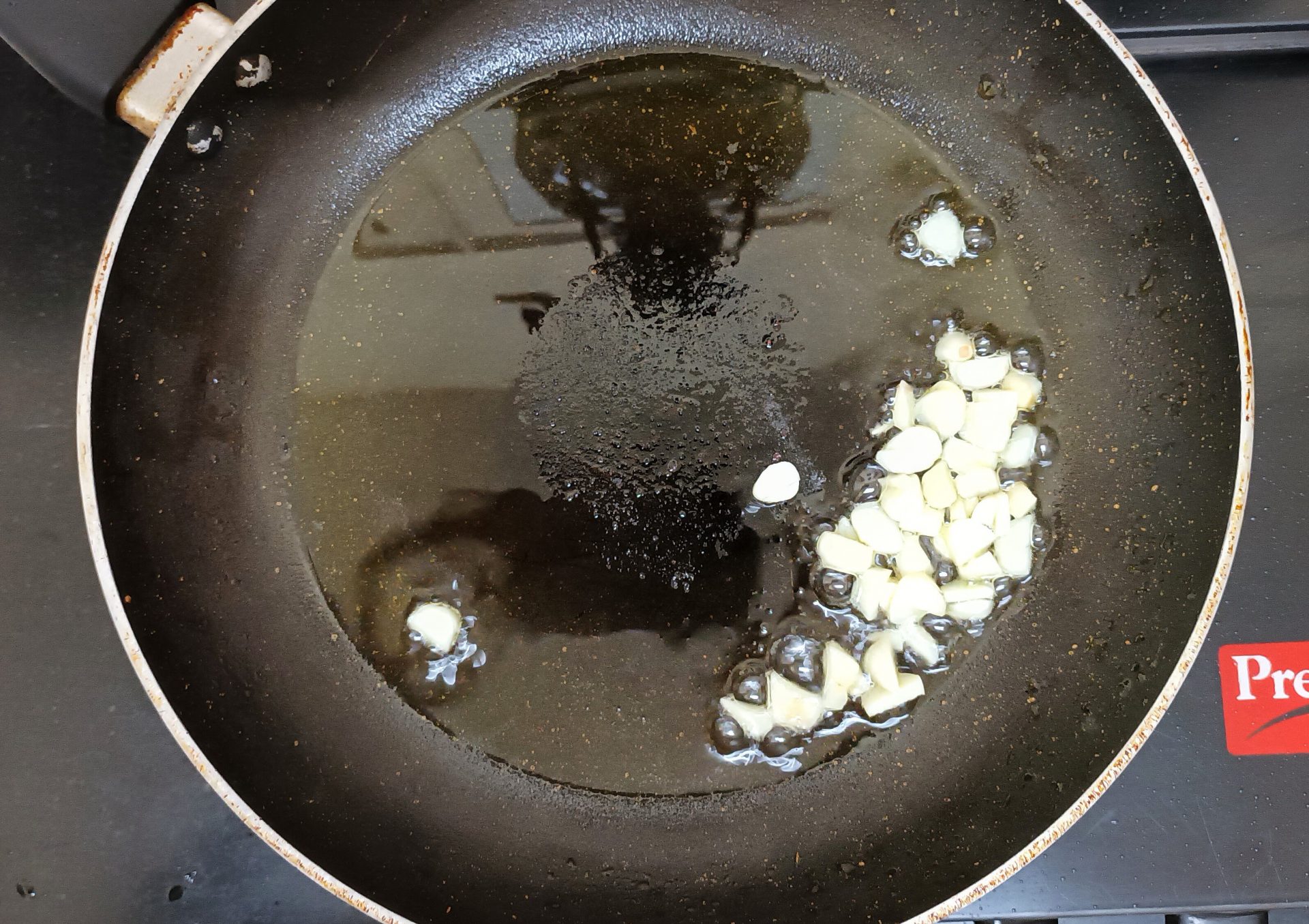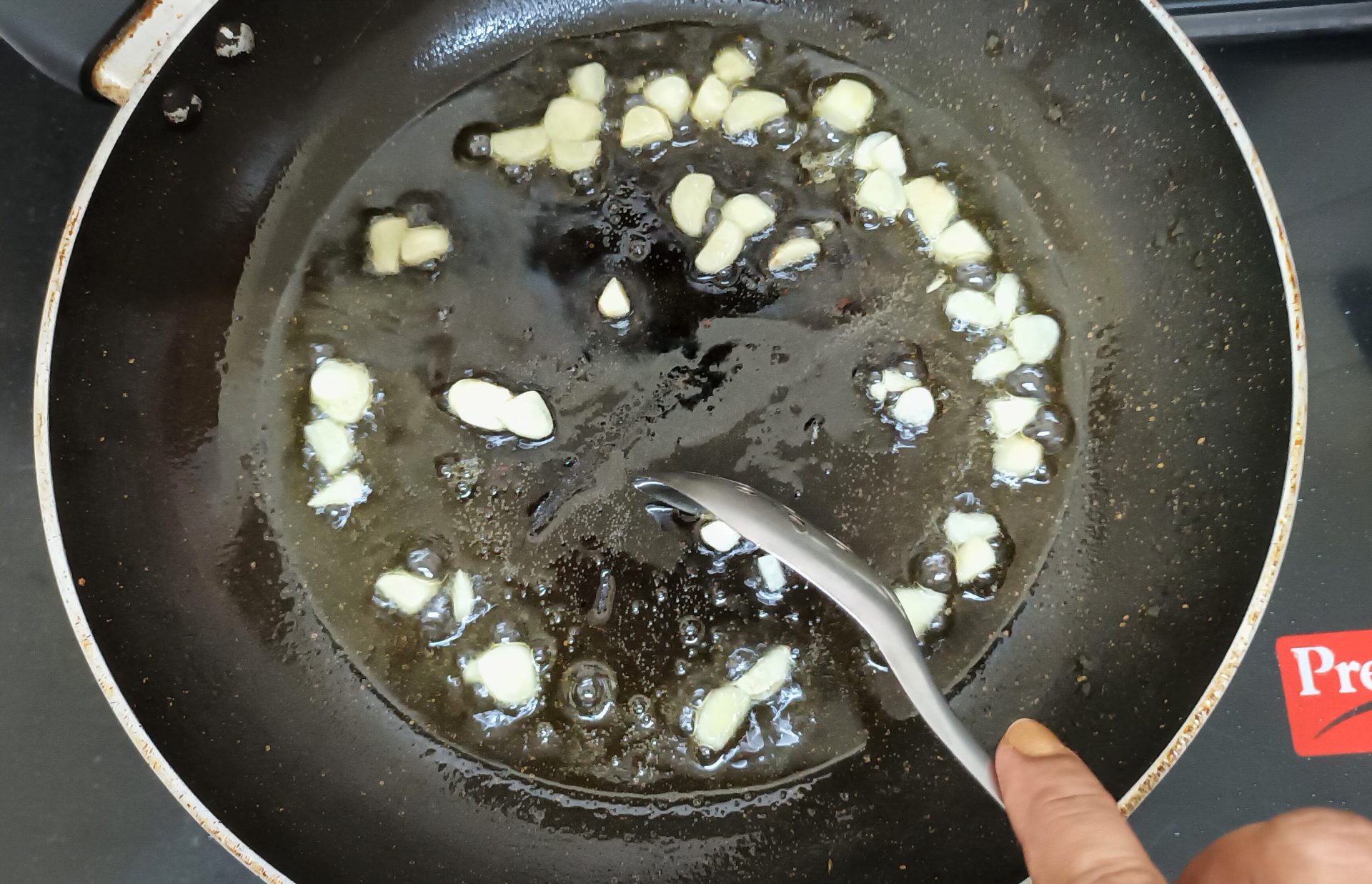 4. Now to the same oil in which the Tofu was fried, add the garlic mince and saute for 30 seconds. Add the onion mince to this and saute until transparent. The onions need not be browned.