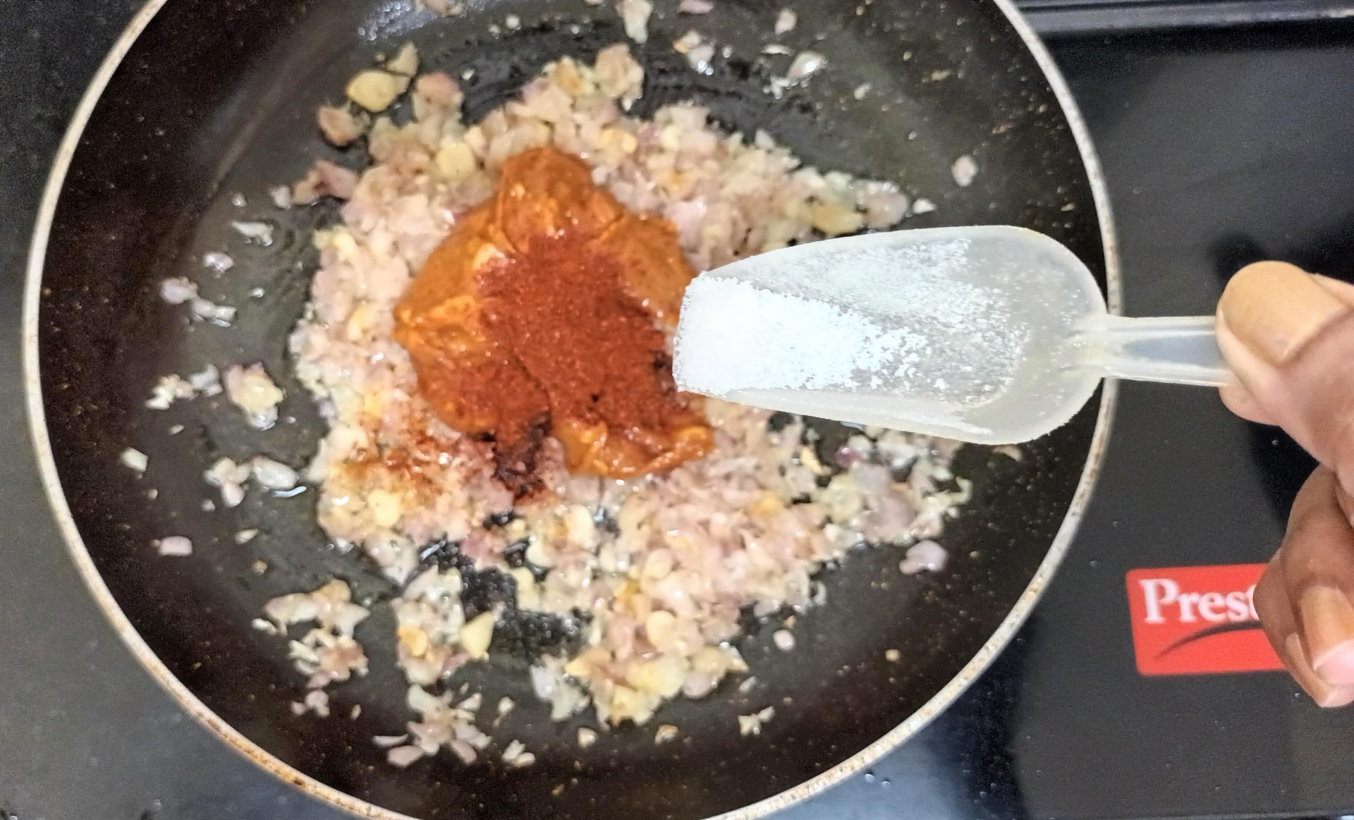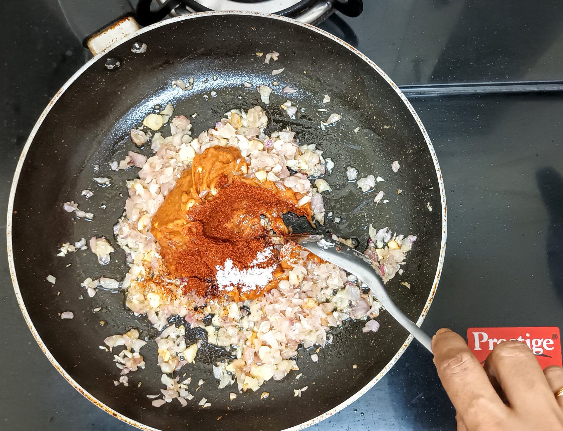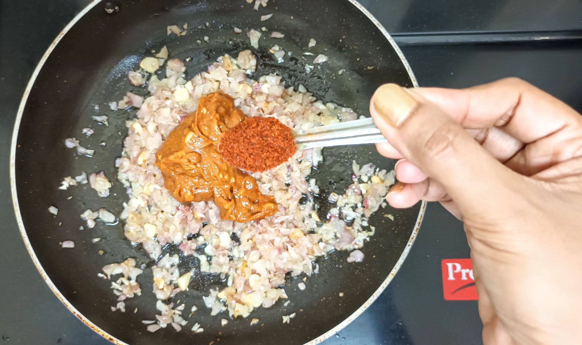 5. Now add the prepared Sambol paste to the sauted onion. Further add red chilli powder, salt, and stir nicely. Let the sauce cook for a minute. Now add 2 tbsp water, and give the sauce a stir.
