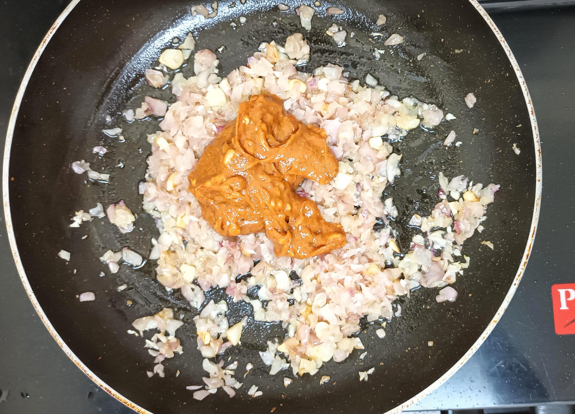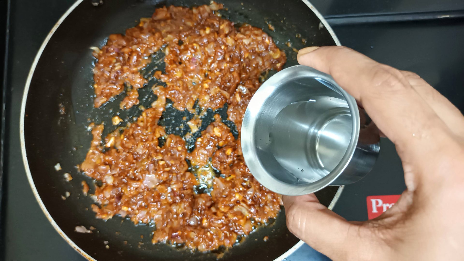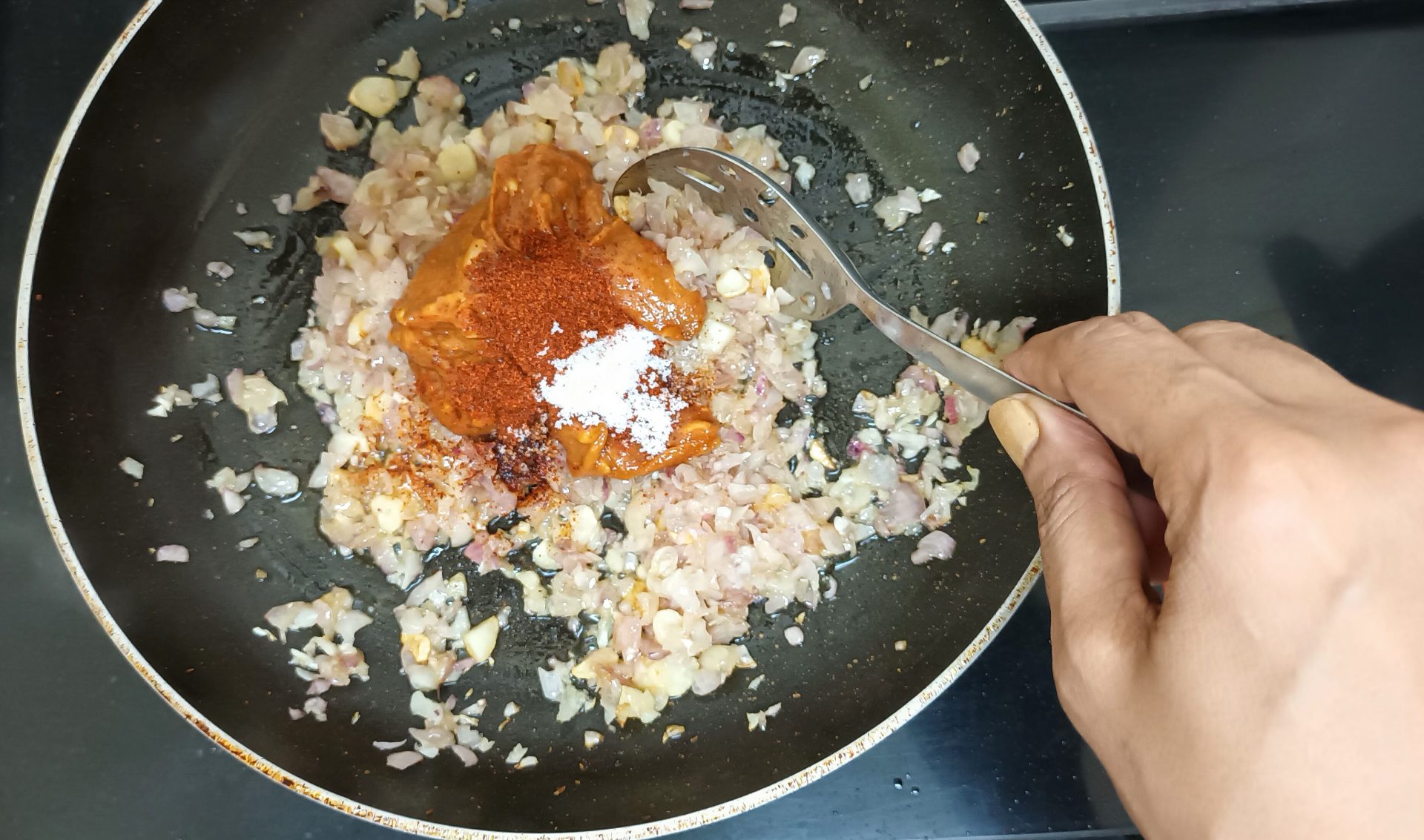 5. Now add the prepared Sambol paste to the sauted onion. Further add red chilli powder, salt, and stir nicely. Let the sauce cook for a minute. Now add 2 tbsp water, and give the sauce a stir.