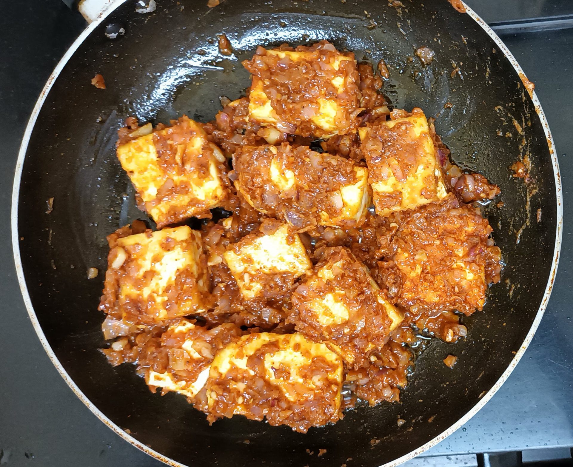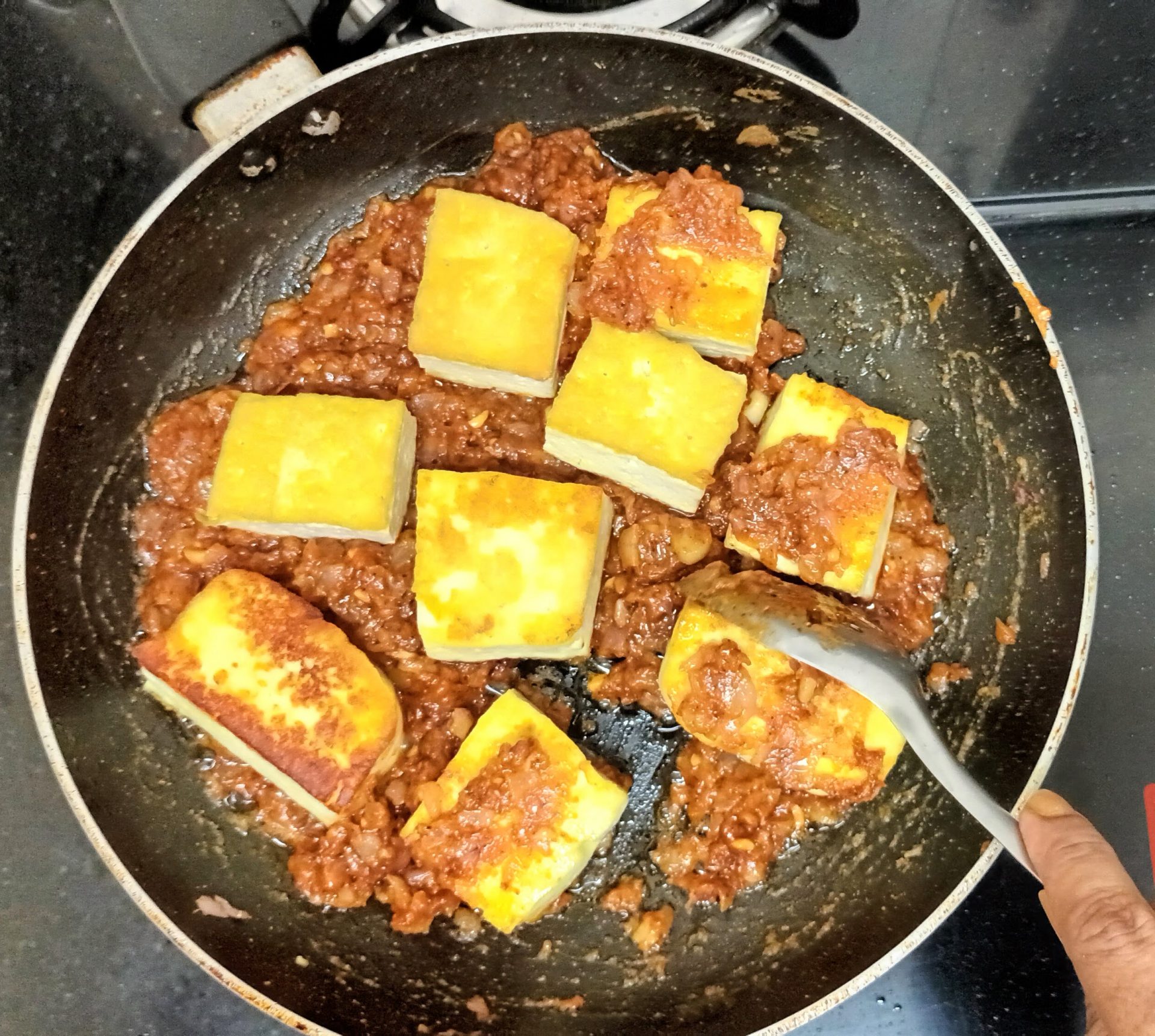 6. Let the sauce cook and come to a semi dry consistency. Now add the tofu cubes and cook covered for 2 minutes on low flame. Stir and cook covered for another minute. Remove lid and check consistency. If there is any moisture, let it evaporate. The sauce should stick to the tofu, and should not be runny like a gravy. Turn off the flame and garnish with spring onion greens. Enjoy as a starter or as ameal with some salad on the side.