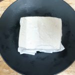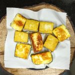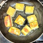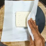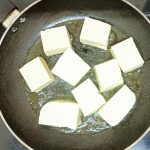 - Remove the Tofu block from the packing, rinse in water, and use paper towels to dab the excess moisture away. I wrap it up in paper towels for 10 minutes, before I start. Now cut the Tofu into cubes (I cut a block into 4 cubes), and pan fry in Sesame oil until golden. Drain on absorbent paper.