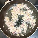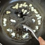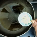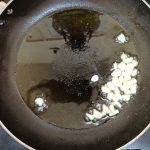 - Now to the same oil in which the Tofu was fried, add the garlic mince and saute for 30 seconds. Add the onion mince to this and saute until transparent. The onions need not be browned.