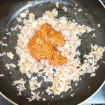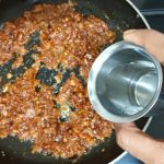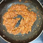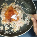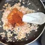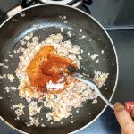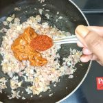 - Now add the prepared Sambol paste to the sauted onion. Further add red chilli powder, salt, and stir nicely. Let the sauce cook for a minute. Now add 2 tbsp water, and give the sauce a stir.