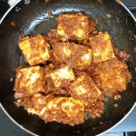 - Let the sauce cook and come to a semi dry consistency. Now add the tofu cubes and cook covered for 2 minutes on low flame. Stir and cook covered for another minute. Remove lid and check consistency. If there is any moisture, let it evaporate. The sauce should stick to the tofu, and should not be runny like a gravy. Turn off the flame and garnish with spring onion greens. Enjoy as a starter or as ameal with some salad on the side.