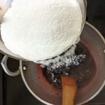 - Now add the flour a little at a time, stirring continuously, just as you do for Upma. When the mixture appears crumbly, turn off the flame and cover the vessel.