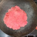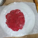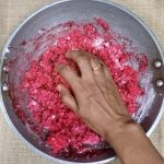 Take the Beetroot stock in a Kadai or heavy bottomed vessel, add salt, oil, and Green Chilli paste and bring it to a roll boil. Add the chopped Coriander leaves, and lower the flame. Now add the flour a little at a time, stirring continuously, just as you do for Upma. When the mixture appears crumbly, turn off the flame and cover the vessel. Let the mixture cool for 10 minutes. Now open the lid, and sprinkling water a little, bring the dough together. Knead well, to form a smooth dough. Apply little oil. There is no resting time for the dough, since it is gluten free. Keep covered until ready to use. When ready to make the Rotis/flatbreads, divide the dough into 10 equal portions. Take a butter/parchment paper, and dust it with rice flour. Dust the dough ball also with a little flour, and roll it out to a thin Roti. If you find rolling cumbersome, you can also spread the dough using your fingers, applying gentle and equal pressure(wetting your fingers in water each time). Heat a Tava/Pan and invert the Roti, along with the parchment paper(paper side facing up). Now gently peel away the paper. Cook the Roti on one side(dust away any flour on the Roti), flip and cook on the other(10 seconds on each side). Now using a tong pick the Roti, and put it over the flame directly. Flip the Roti over the flame and cook the other side.(refer notes)