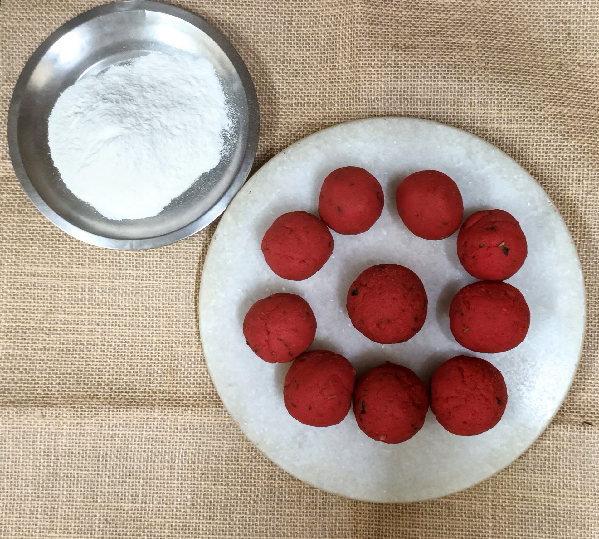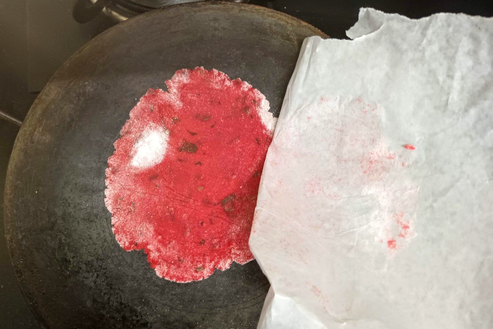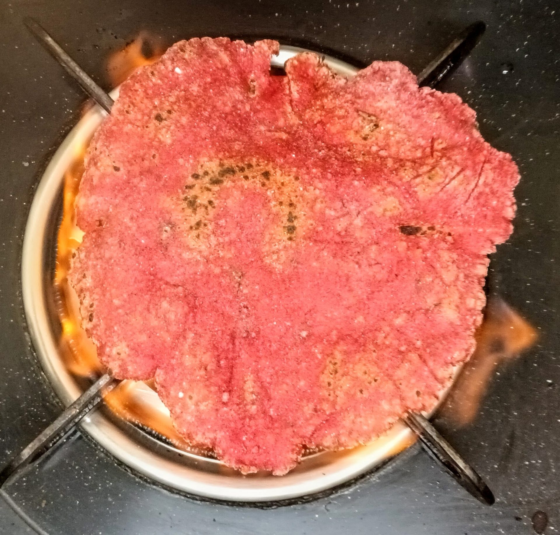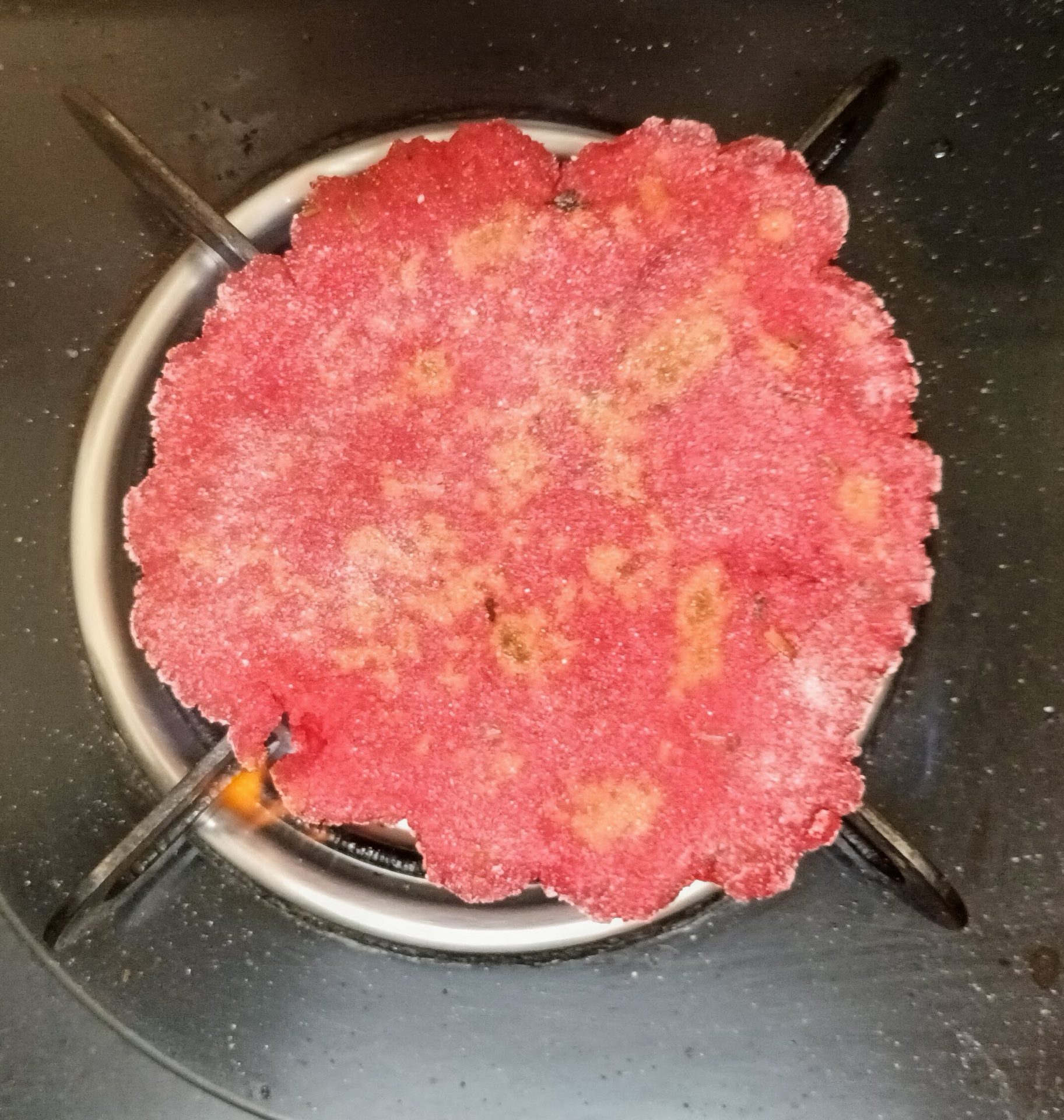 Take the Beetroot stock in a Kadai or heavy bottomed vessel, add salt, oil, and Green Chilli paste and bring it to a roll boil. Add the chopped Coriander leaves, and lower the flame. Now add the flour a little at a time, stirring continuously, just as you do for Upma. When the mixture appears crumbly, turn off the flame and cover the vessel. Let the mixture cool for 10 minutes. Now open the lid, and sprinkling water a little, bring the dough together. Knead well, to form a smooth dough. Apply little oil. There is no resting time for the dough, since it is gluten free. Keep covered until ready to use. When ready to make the Rotis/flatbreads, divide the dough into 10 equal portions. Take a butter/parchment paper, and dust it with rice flour. Dust the dough ball also with a little flour, and roll it out to a thin Roti. If you find rolling cumbersome, you can also spread the dough using your fingers, applying gentle and equal pressure(wetting your fingers in water each time). Heat a Tava/Pan and invert the Roti, along with the parchment paper(paper side facing up). Now gently peel away the paper. Cook the Roti on one side(dust away any flour on the Roti), flip and cook on the other(10 seconds on each side). Now using a tong pick the Roti, and put it over the flame directly. Flip the Roti over the flame and cook the other side.(refer notes)