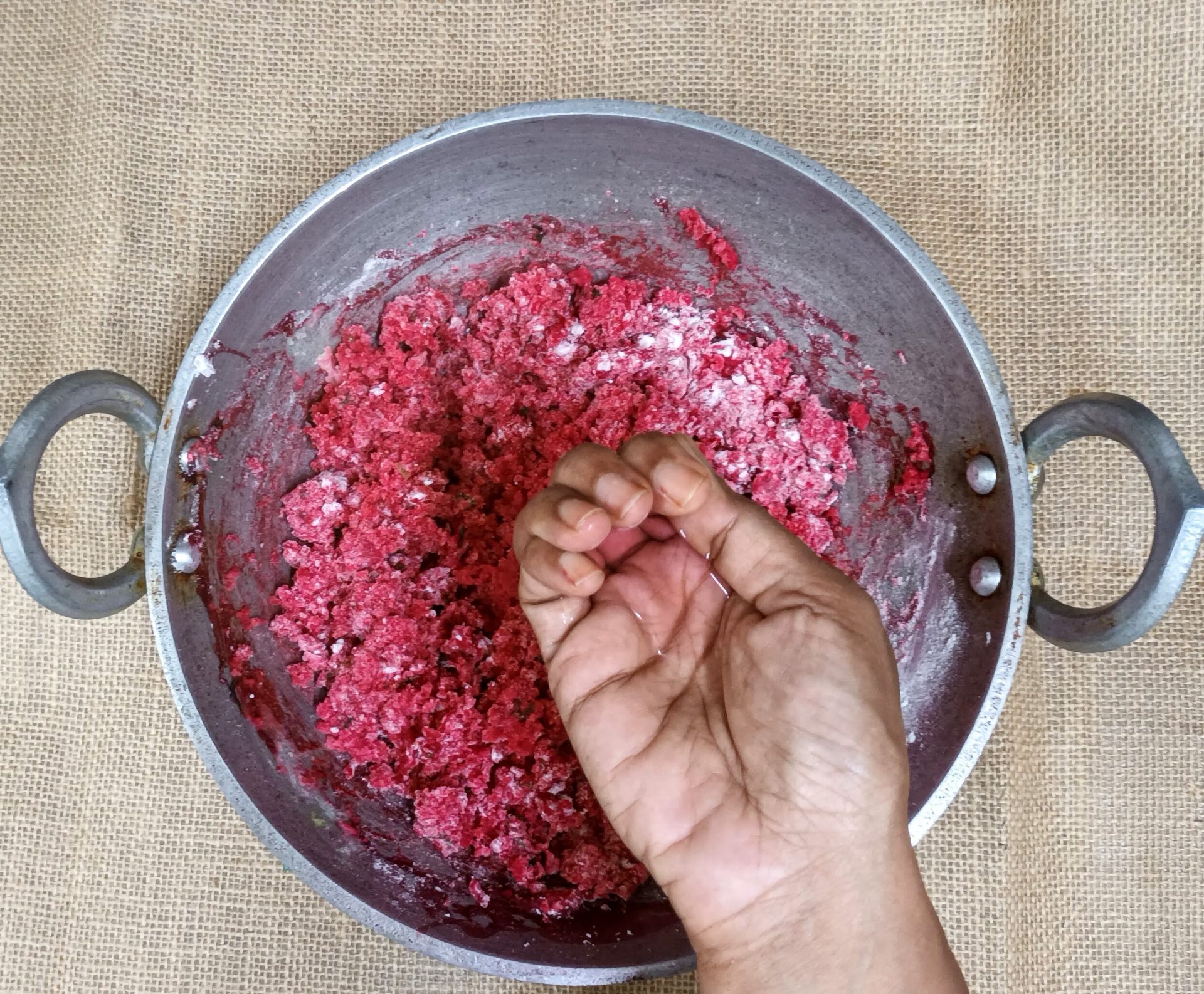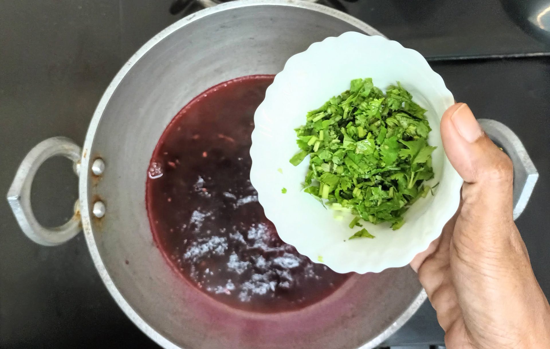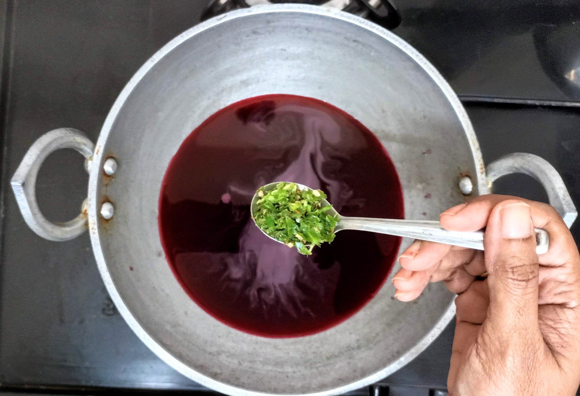 - Take the Beetroot stock in a Kadai or heavy bottomed vessel, add salt, oil, and Green Chilli paste and bring it to a roll boil. Add the chopped Coriander leaves, and lower the flame.