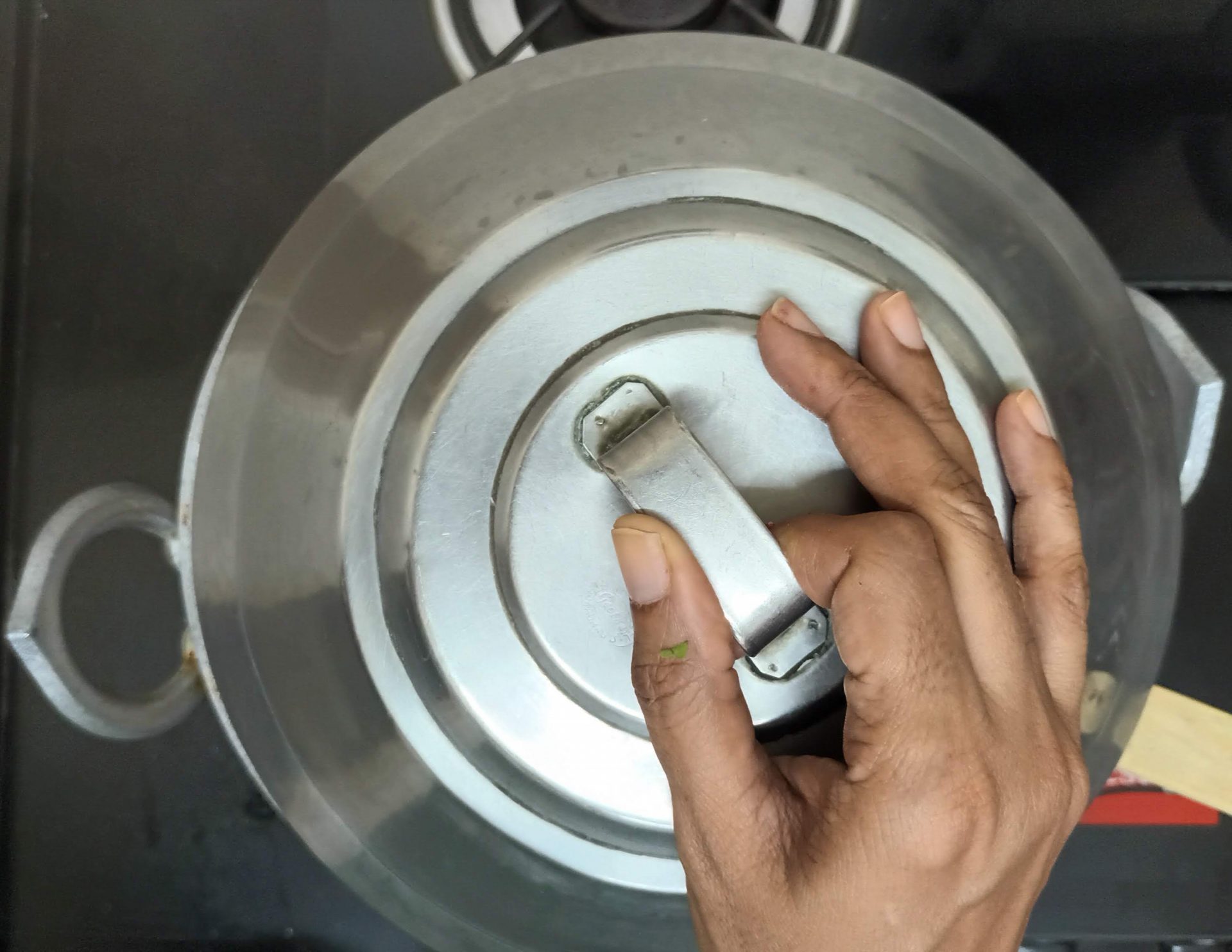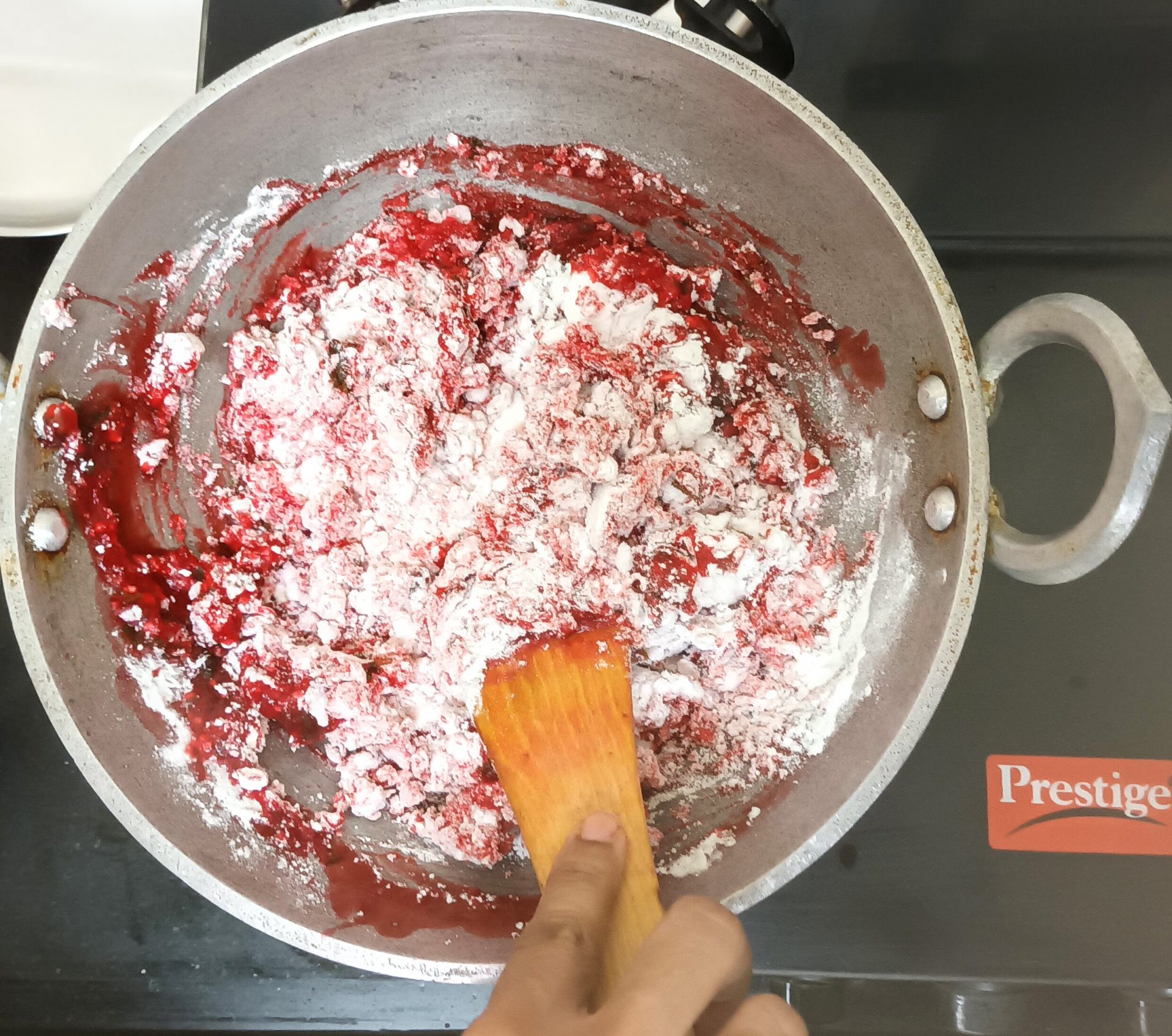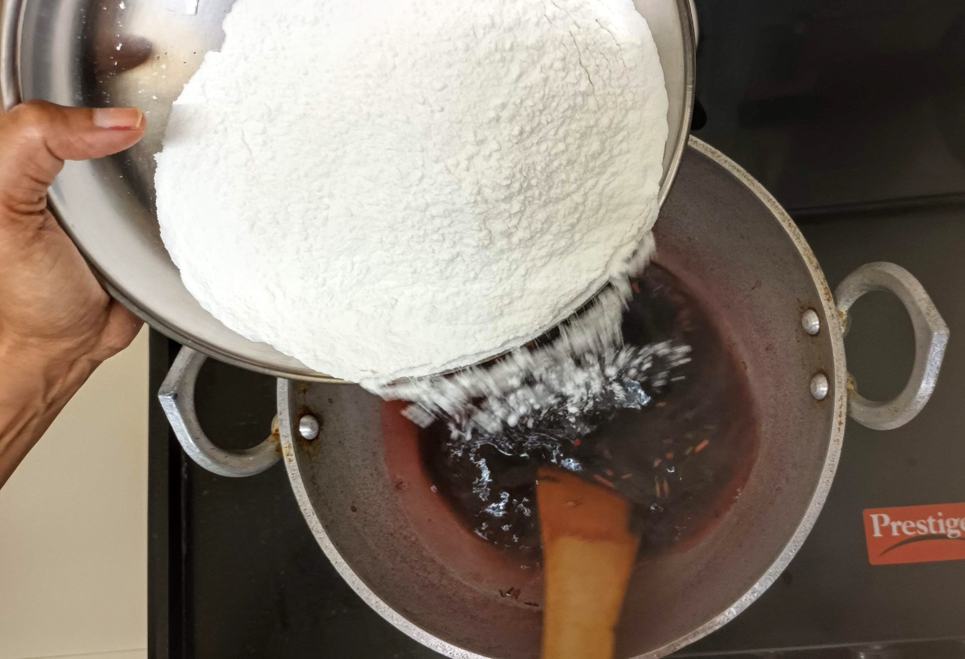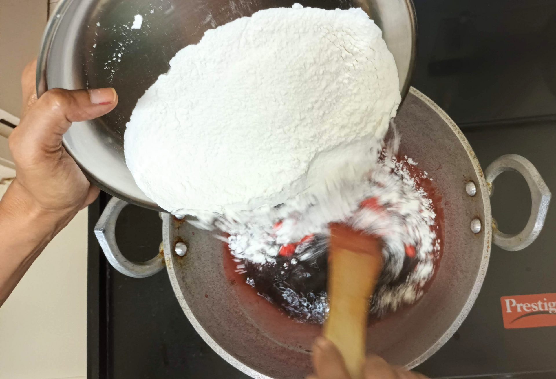 - Now add the flour a little at a time, stirring continuously, just as you do for Upma. When the mixture appears crumbly, turn off the flame and cover the vessel.