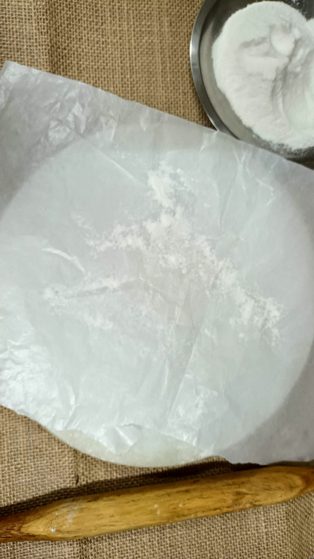 - When ready to make the Rotis/flatbreads, divide the dough into 10 equal portions. Take a butter/parchment paper, and dust it with rice flour. Dust the dough ball also with a little flour, and roll it out to a thin Roti. If you find rolling cumbersome, you can also spread the dough using your fingers, applying gentle and equal pressure(wetting your fingers in water each time).