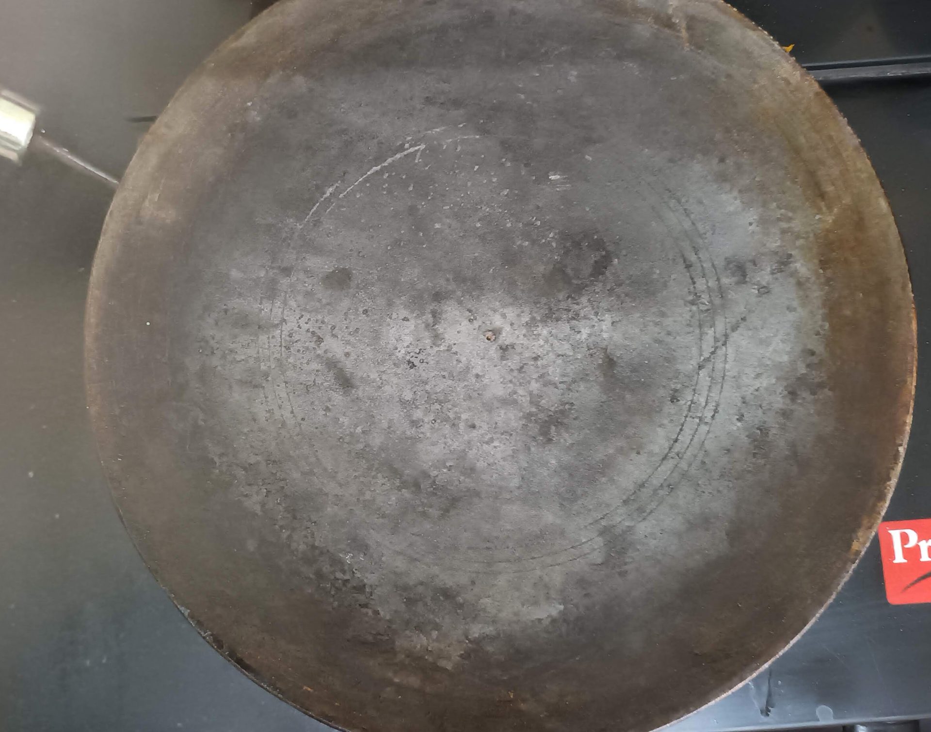 - Heat a Tava/Pan and invert the Roti, along with the parchment paper(paper side facing up). Now gently peel away the paper. Cook the Roti on one side(dust away any flour on the Roti), flip and cook on the other(10 seconds on each side). Now using a tong pick the Roti, and put it over the flame directly. Flip the Roti over the flame and cook the other side.(refer notes)