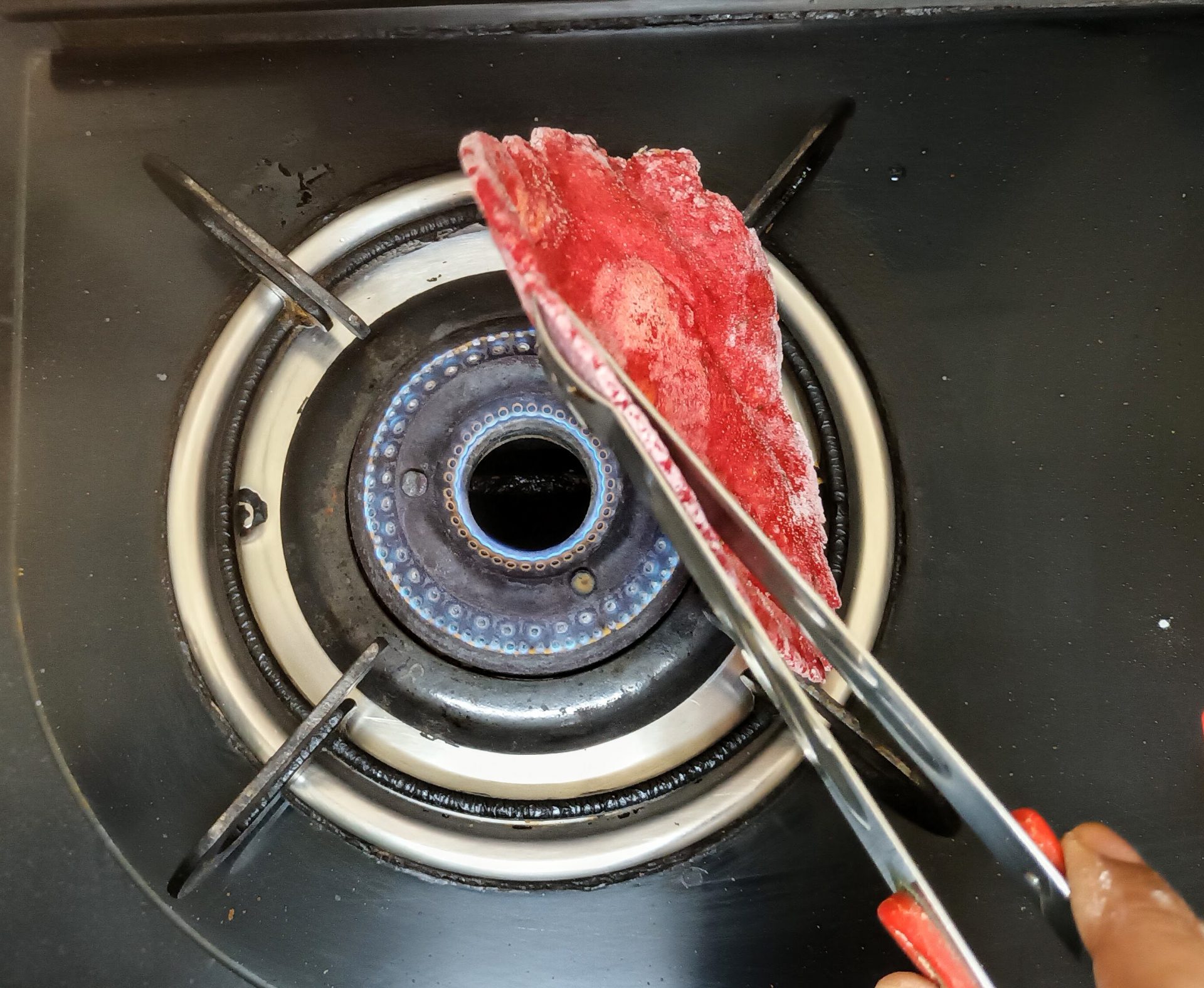 - When you cook the Roti on a Tava, dust away any specks of remaining dusting flour. If there is a lot of flour on the roti, when you cook it over direct flame, the flour begins to burn, thereby charring the Roti.