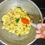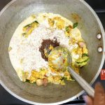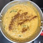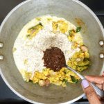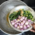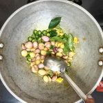 - When the Shallots begin to brown, add the mashed Pidi Karanai ,salt, and red chilli powder, saute this well in the oil. About 2 minutes on low flame.