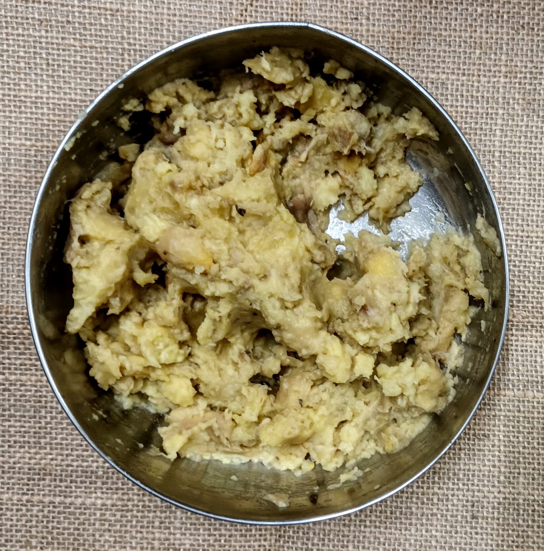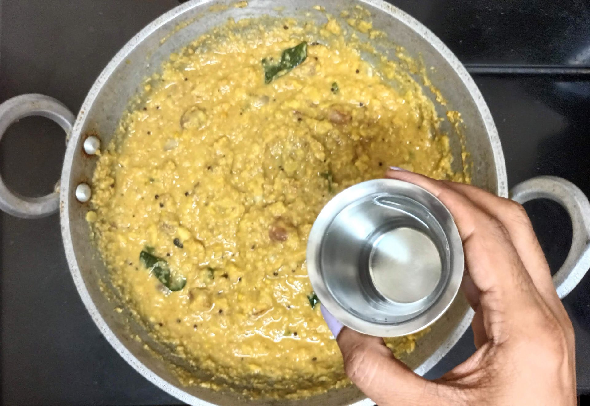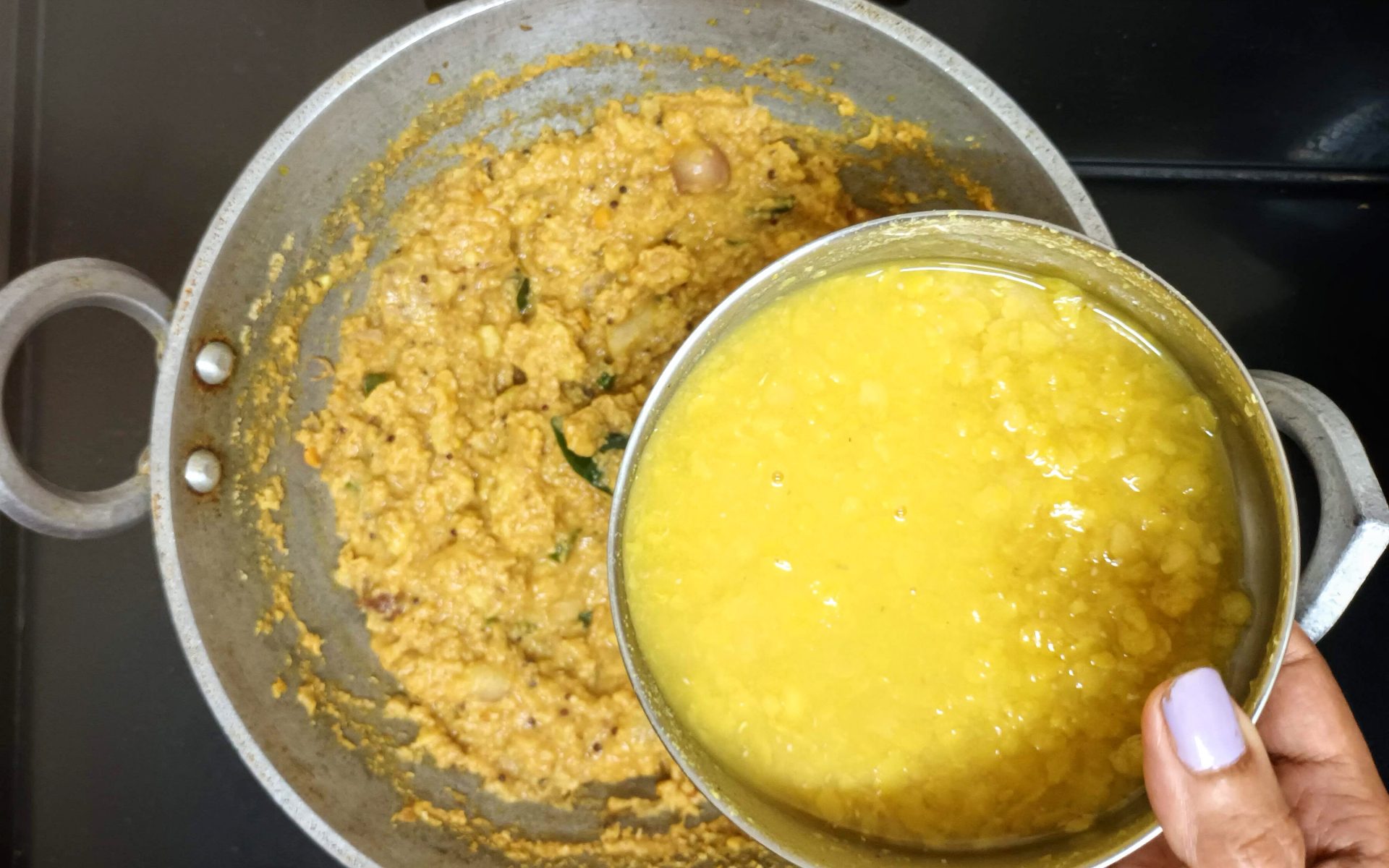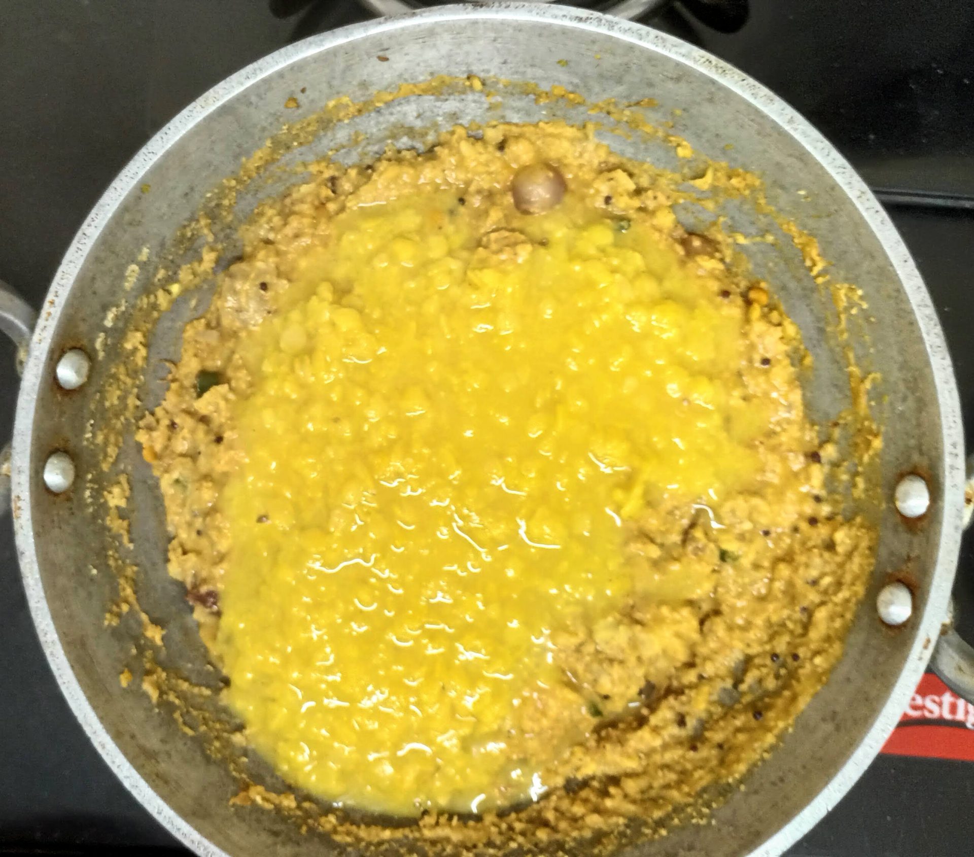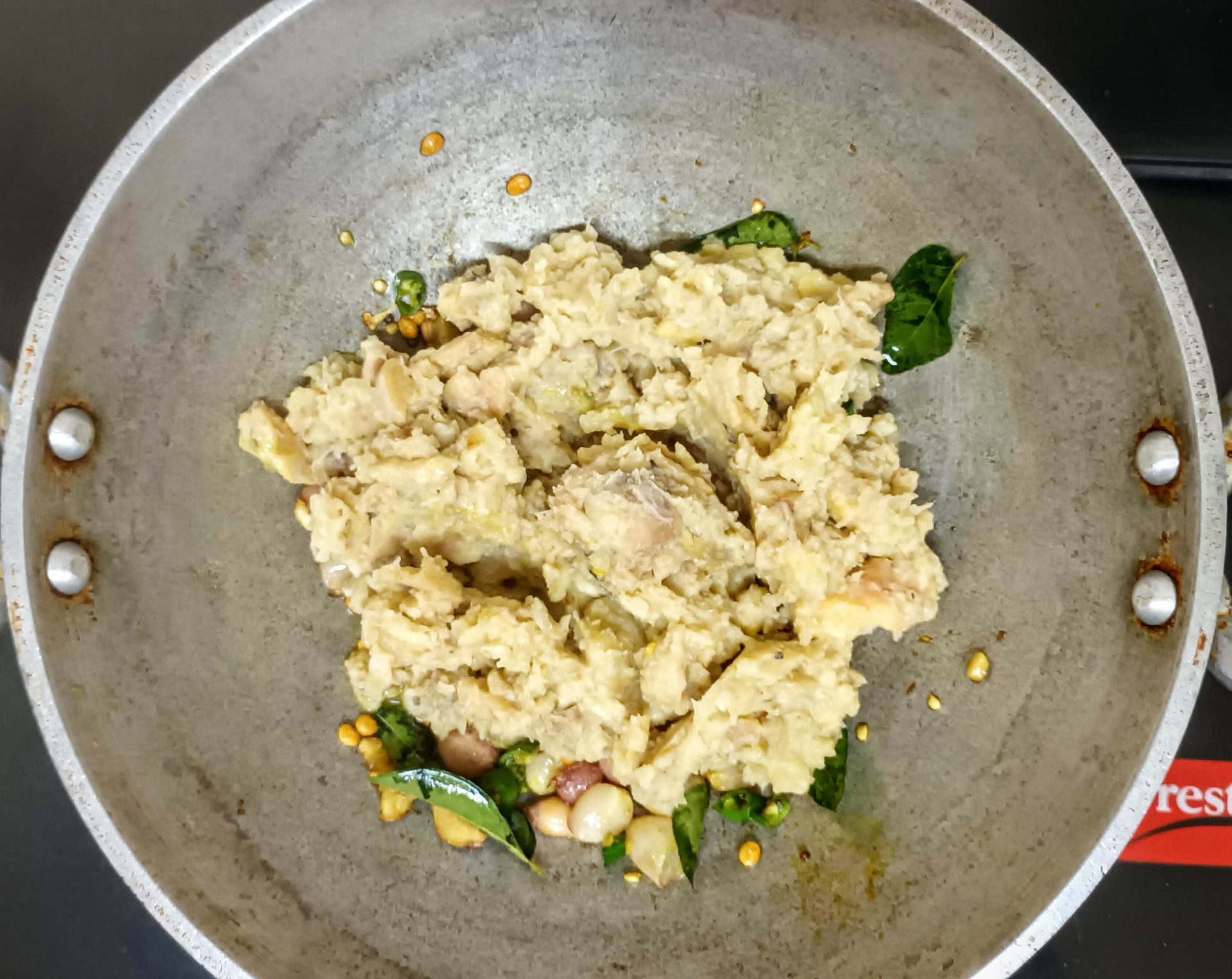 - Pressure cook the tubers (Pidi Karanai), and the Dal separately, until soft. Add a little salt to the tubers and turmeric powder to the Dal before placing in the cooker. Once cooked peel the Pidi Karanai and mash it well. Mash the cooked Dal with the back of a ladle, and set aside.