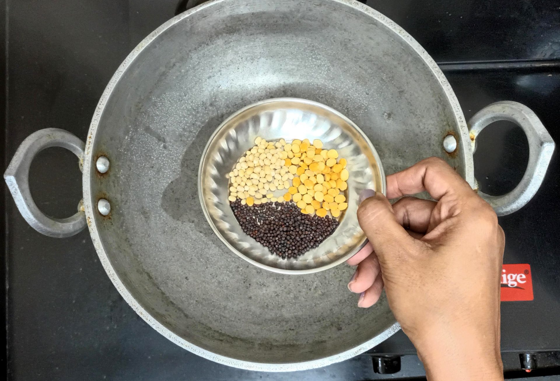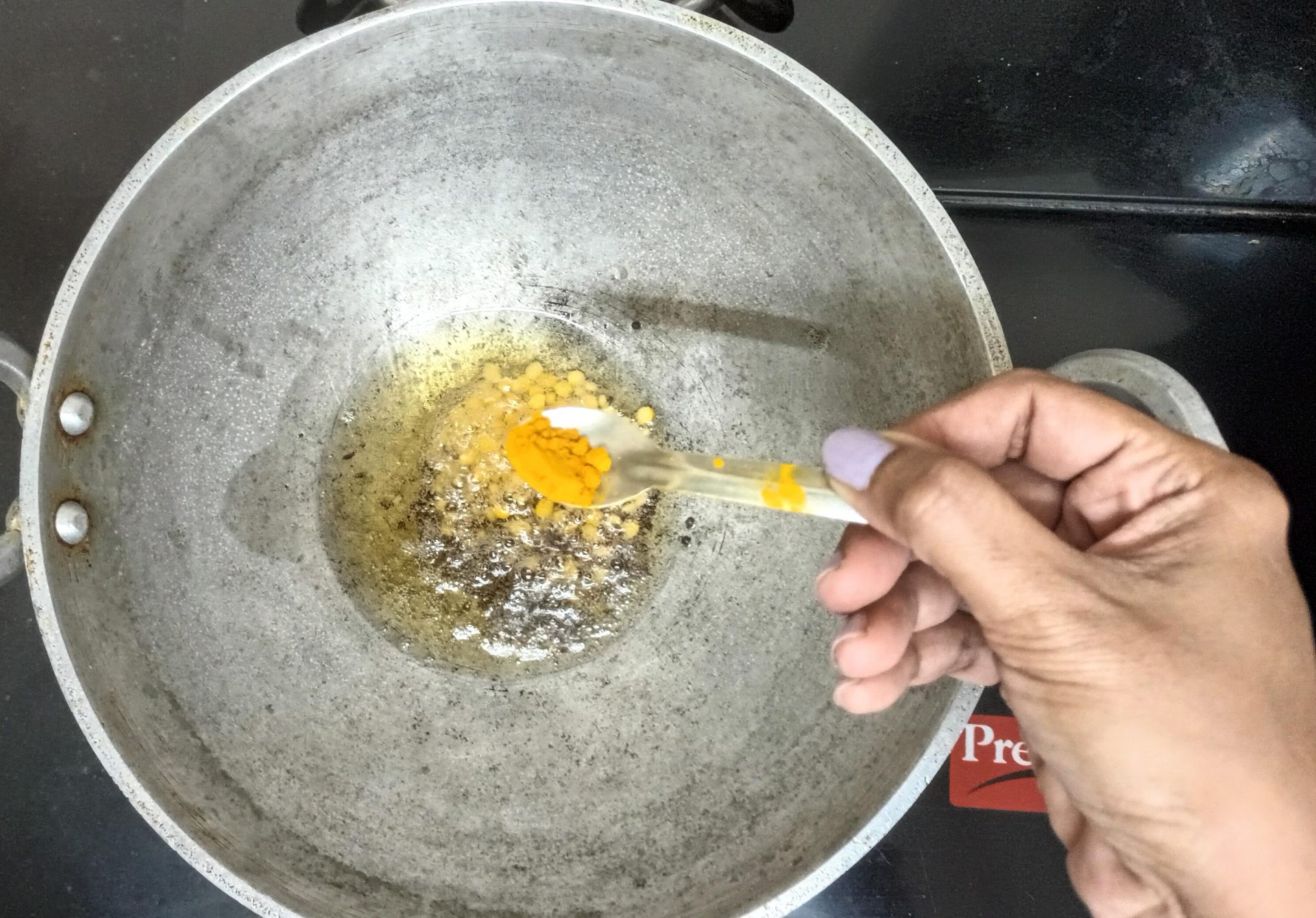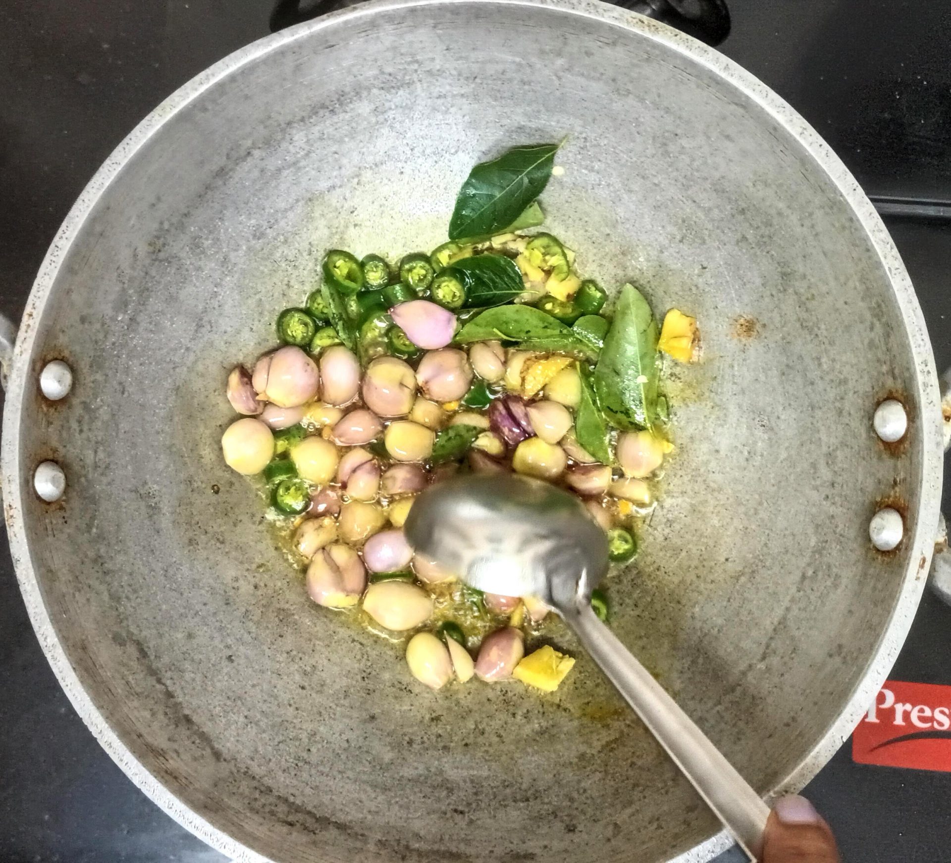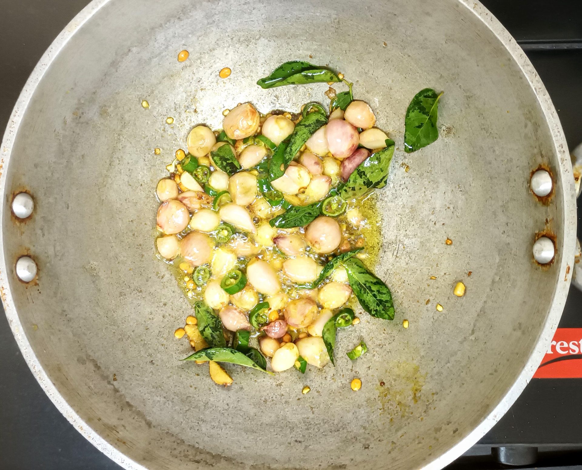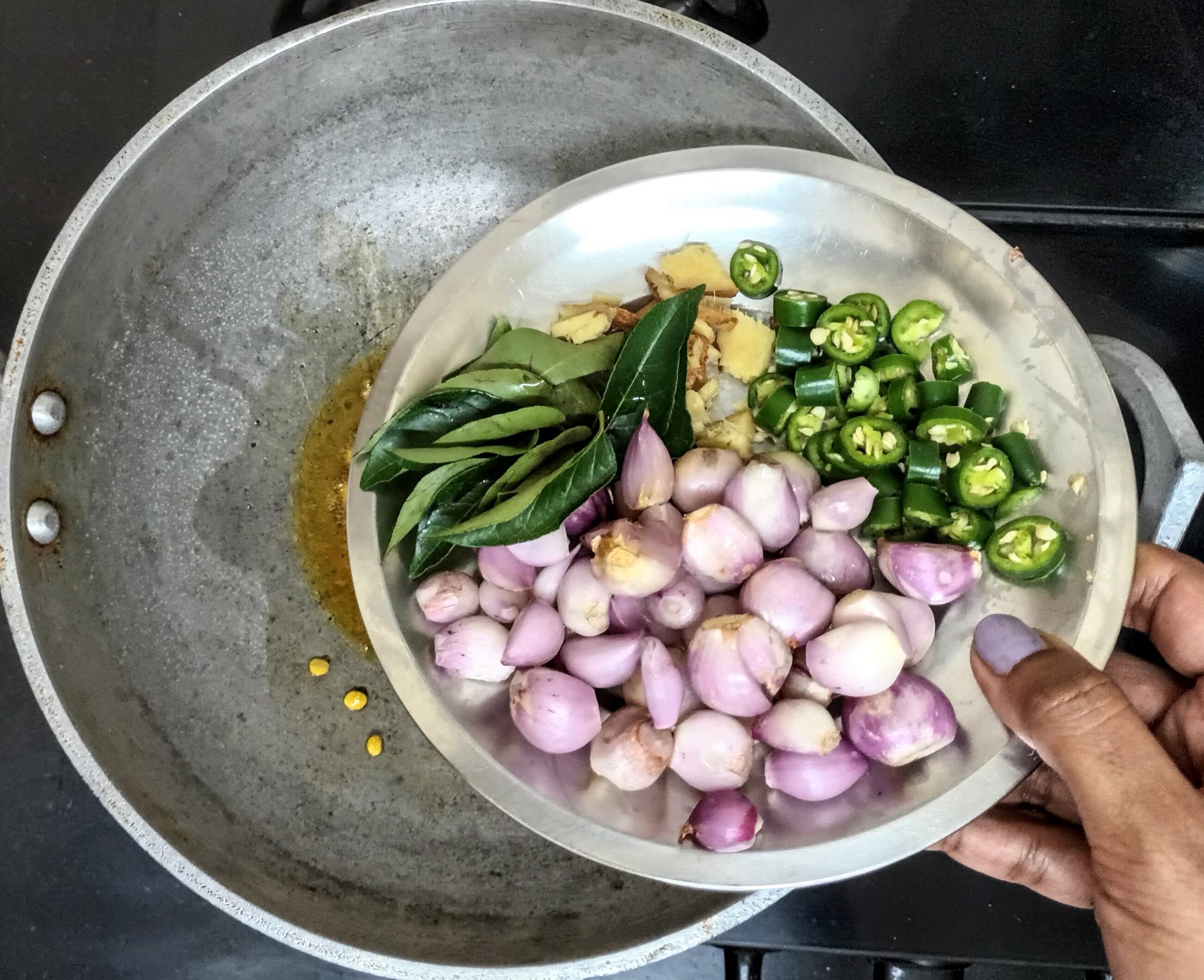 - Next, take oil in a Kadai/Pan and heat. Put all the ingredients mentioned under “to temper”. When the Mustard seeds crackle, add the Shallots, green chillies, ginger and curry leaves, turmeric powder, and fry nicely.
