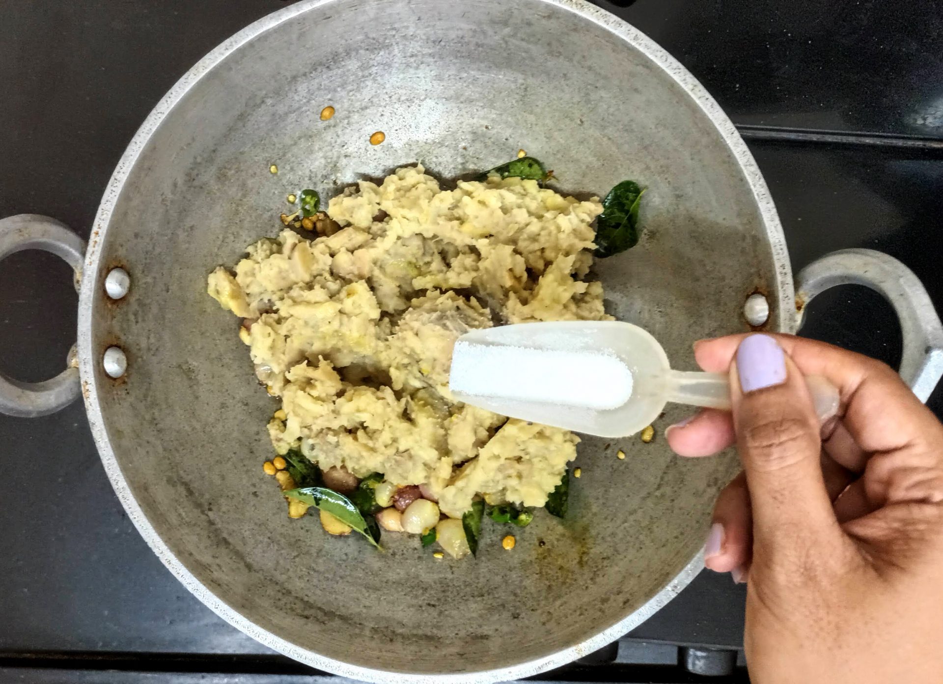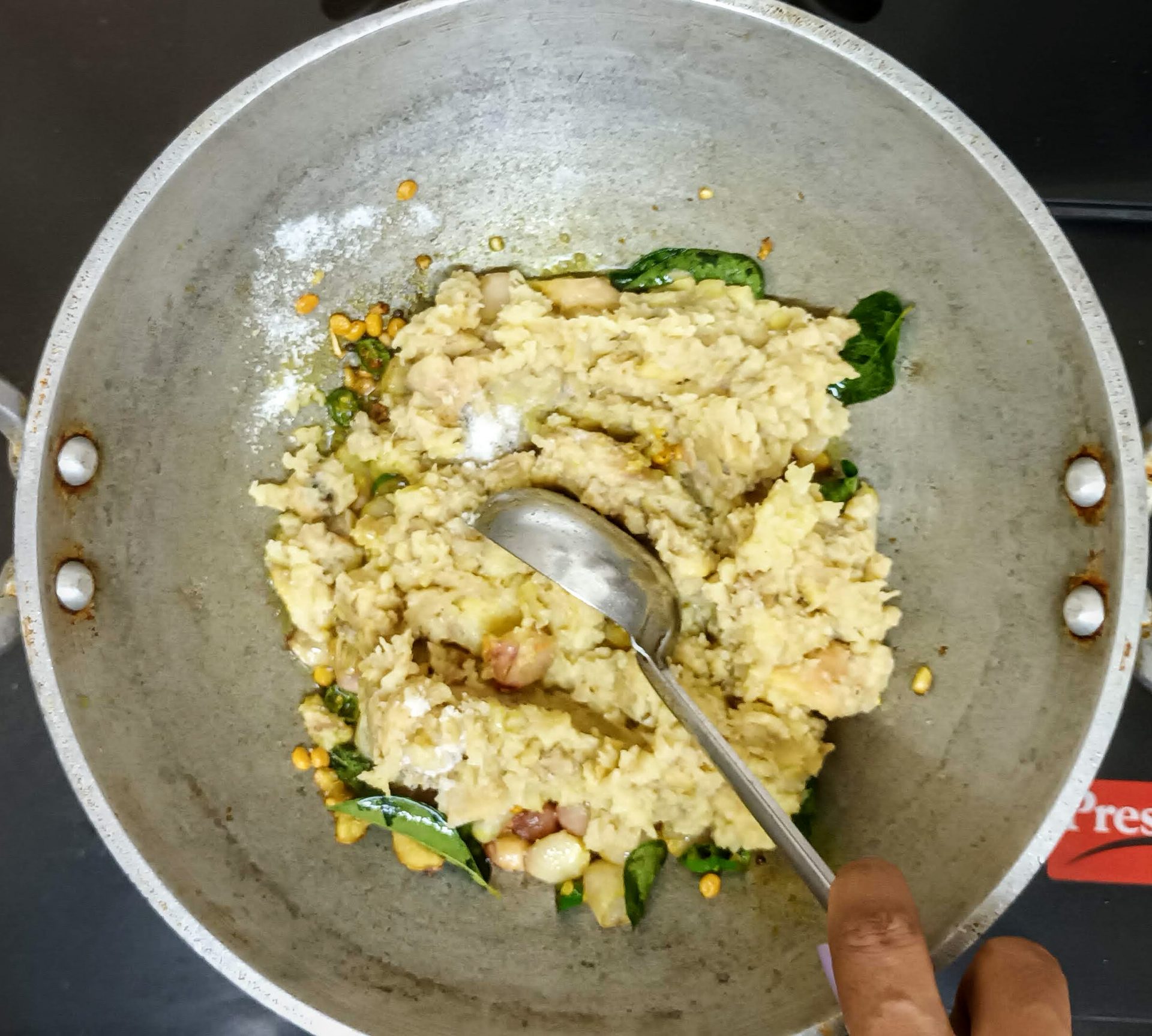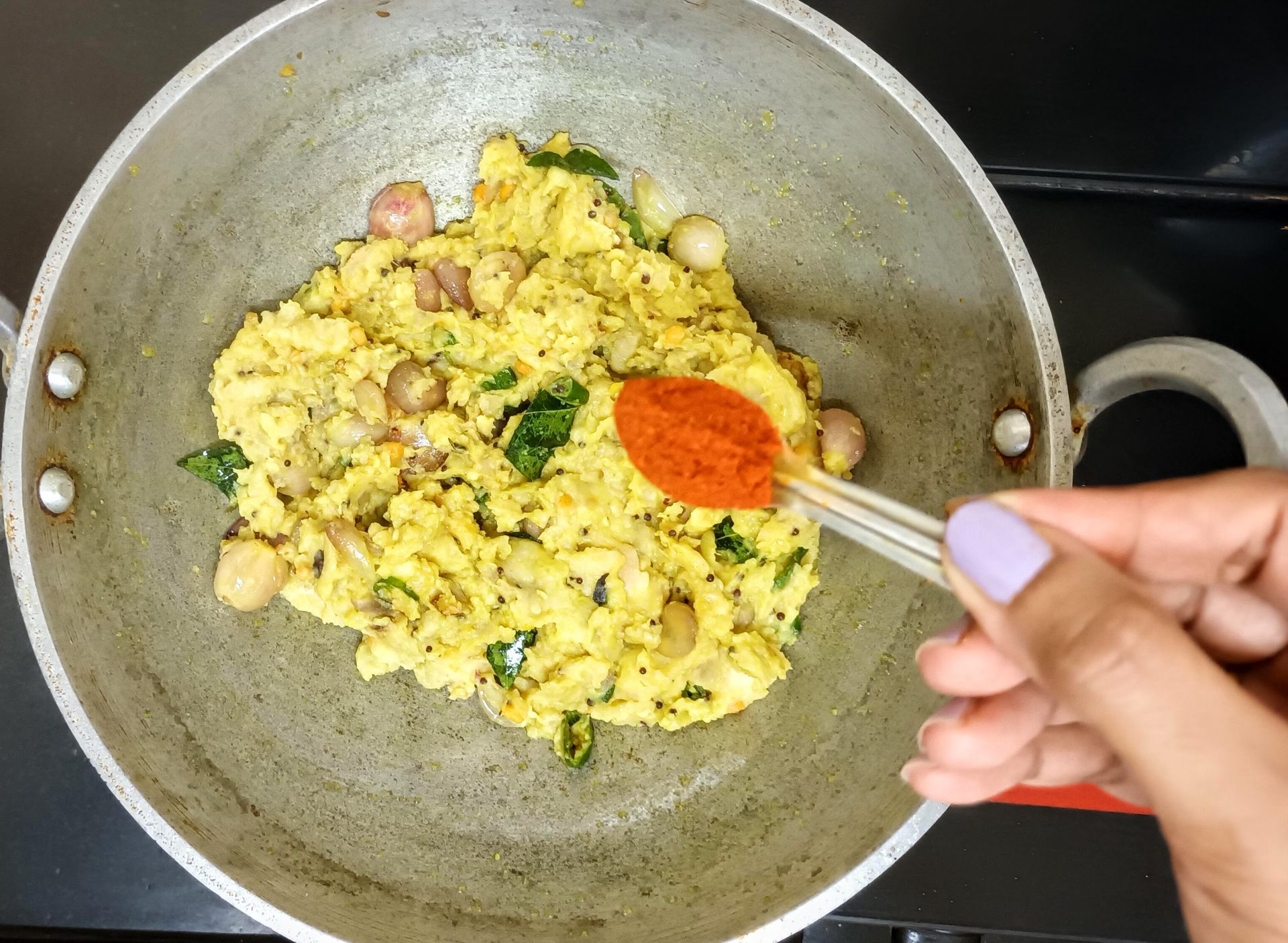 - When the Shallots begin to brown, add the mashed Pidi Karanai ,salt, and red chilli powder, saute this well in the oil. About 2 minutes on low flame.