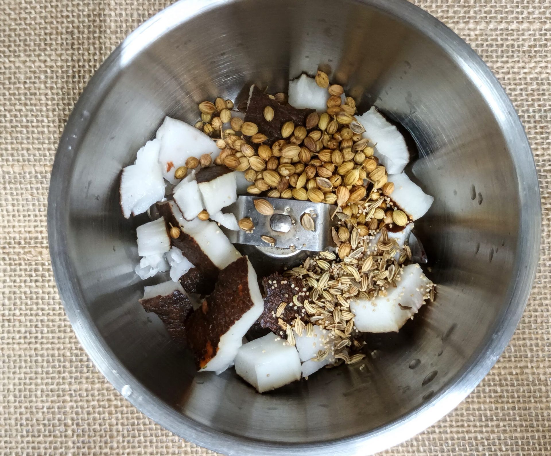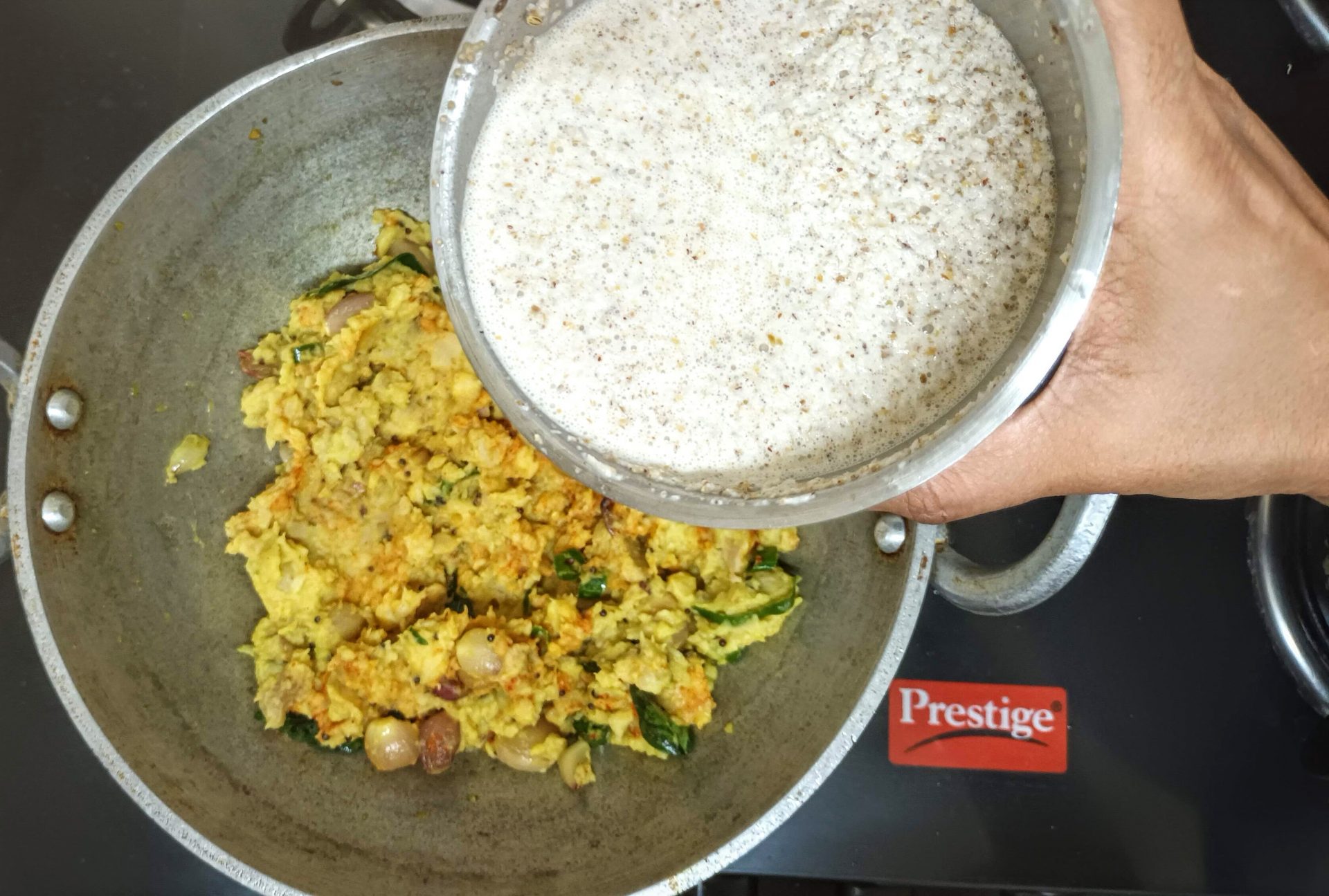 - Now add all ingredients mentioned under “to be ground to a paste” to a blender jar, and grind to a smooth paste with some water. Add this paste to the onion and Pidi Karanai mash.