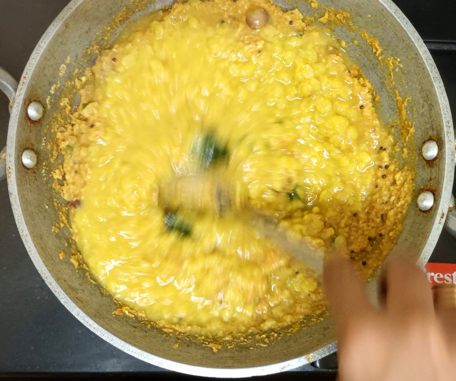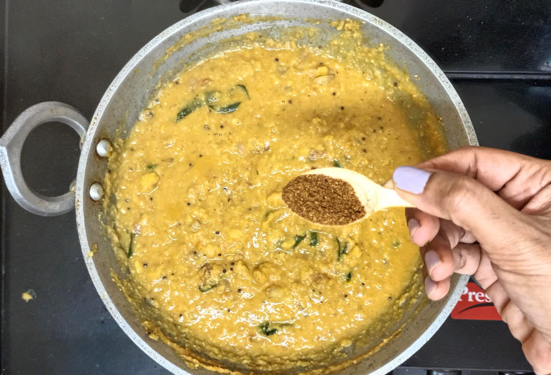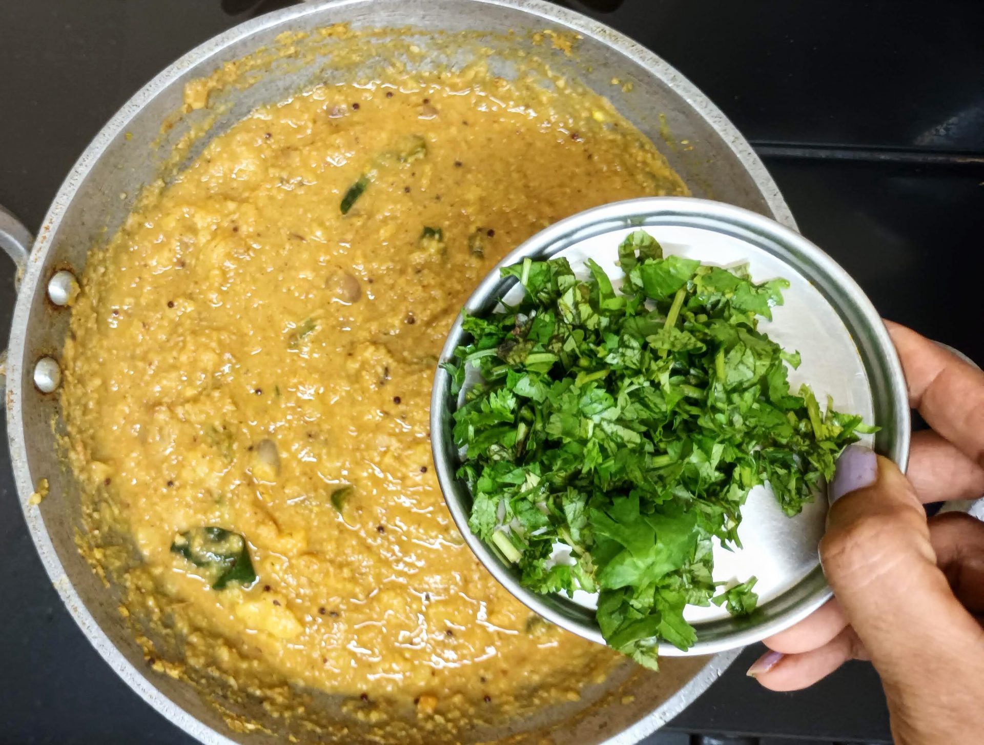 - Now add the Tamarind pulp, and stir nicely. Now add the cooked and mashed Dal, and give it all a good stir. Let it cook on low flame for 2 minutes. Add 1/2 cup water to adjust consistency if too thick. Finally, add Garam Masala powder, and finely chopped coriander leaves and turn off the flame.