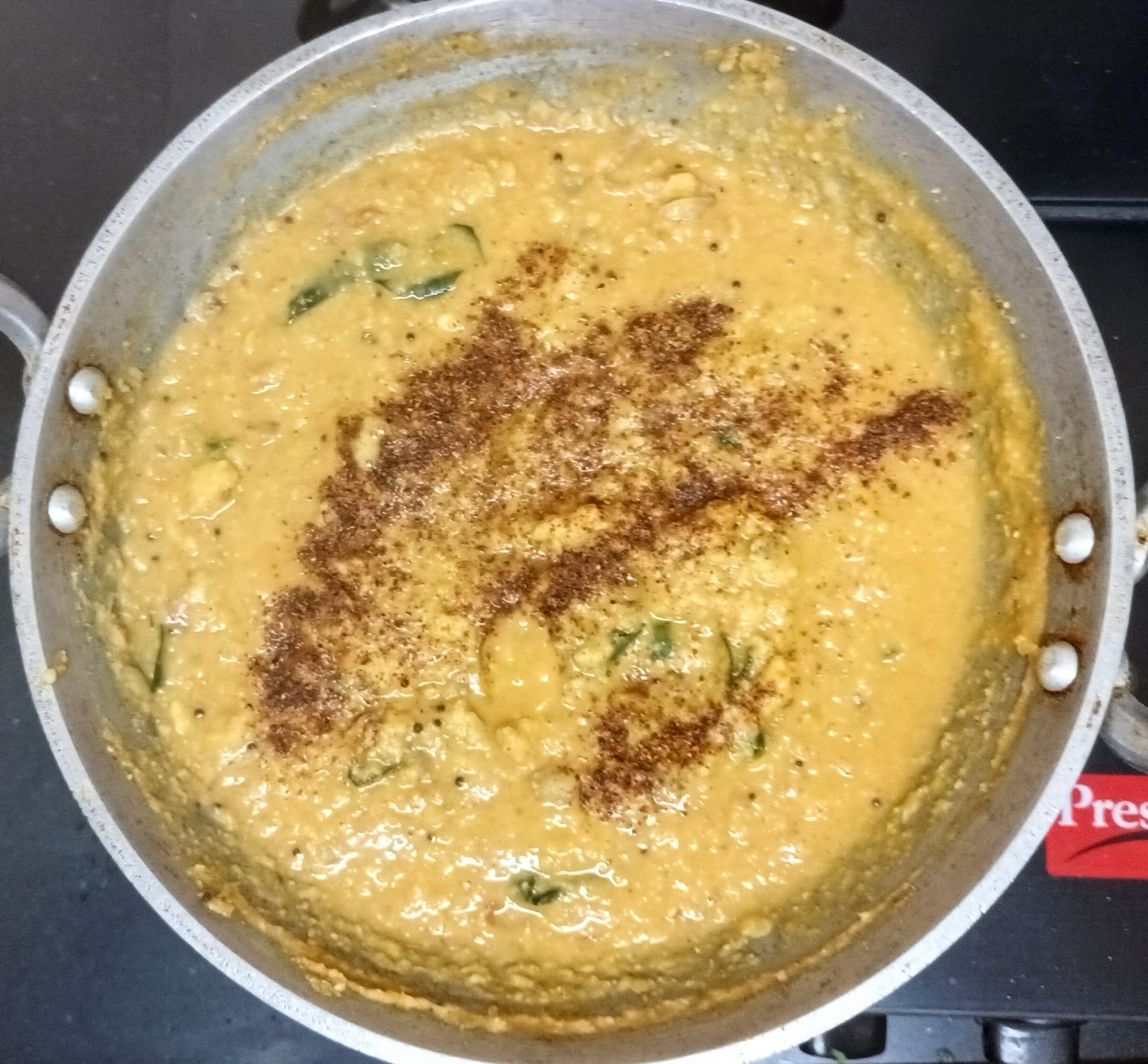 Pressure cook the tubers (Pidi Karanai), and the Dal separately, until soft. Add a little salt to the tubers and turmeric powder to the Dal before placing in the cooker. Once cooked peel the Pidi Karanai and mash it well. Mash the cooked Dal with the back of a ladle, and set aside. Next, take oil in a Kadai/Pan and heat. Put all the ingredients mentioned under “to temper”. When the Mustard seeds crackle, add the Shallots, green chillies, ginger and curry leaves and fry nicely. Add turmeric powder. When the Shallots begin to brown, add the mashed Pidi Karanai ,salt, and red chilli powder, saute this well in the oil. About 2 minutes on low flame. Now add all ingredients mentioned under “to be ground to a paste” to a blender jar, and grind to a smooth paste with some water. Add this paste to the onion and Pidi Karanai mash. Now add the Tamarind pulp, and stir nicely. Now add the cooked and mashed Dal, and give it all a good stir. Let it cook on low flame for 2 minutes. Add 1/2 cup water to adjust consistency if too thick. Finally, add Garam Masala powder, and finely chopped coriander leaves and turn off the flame.