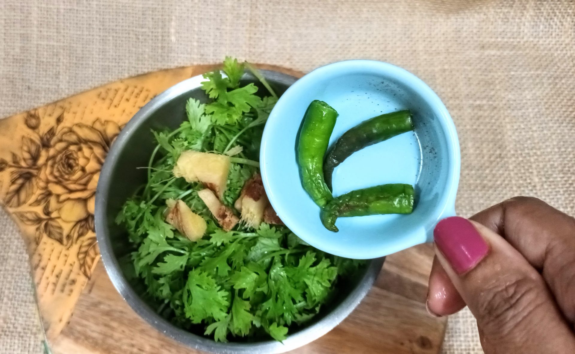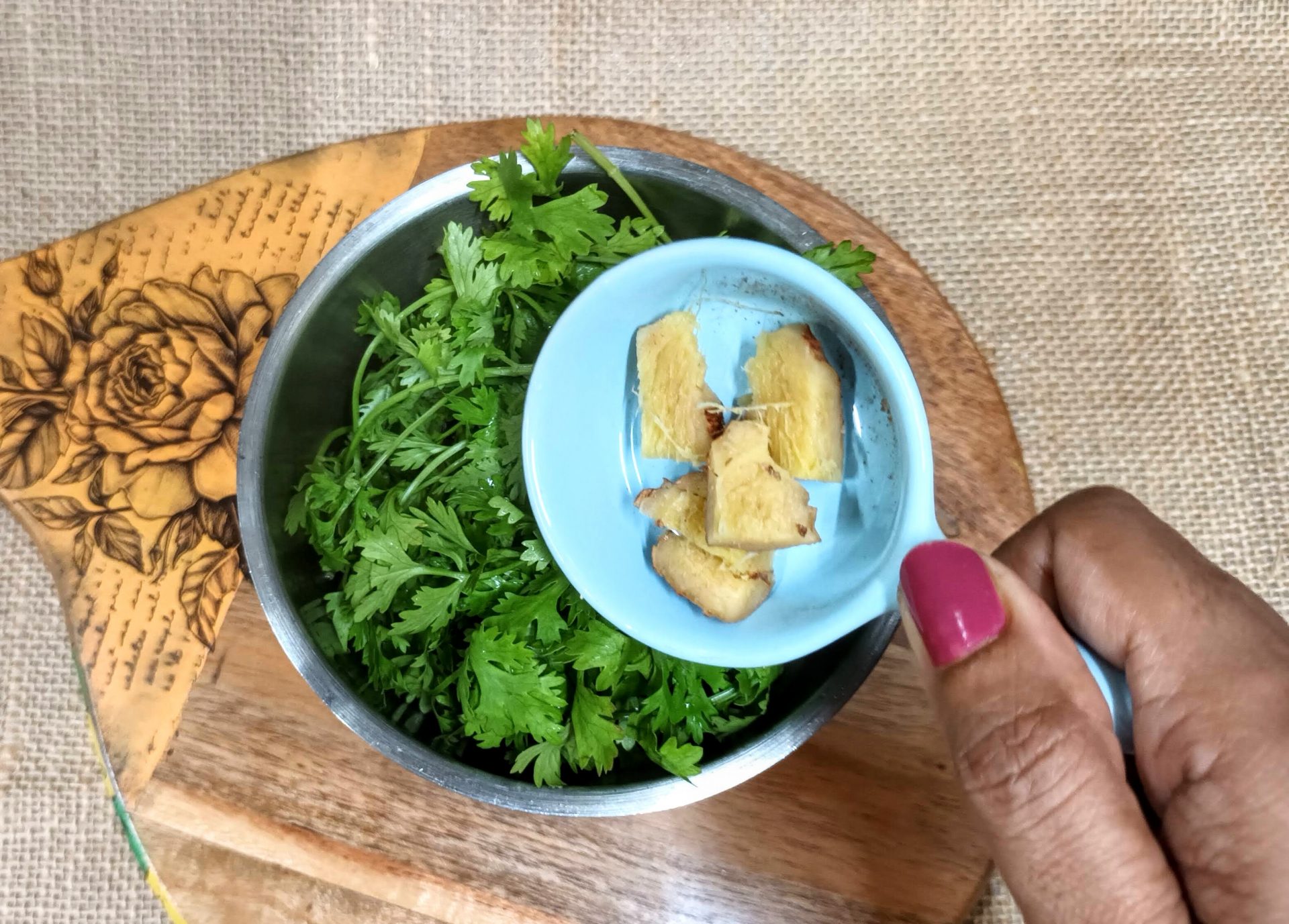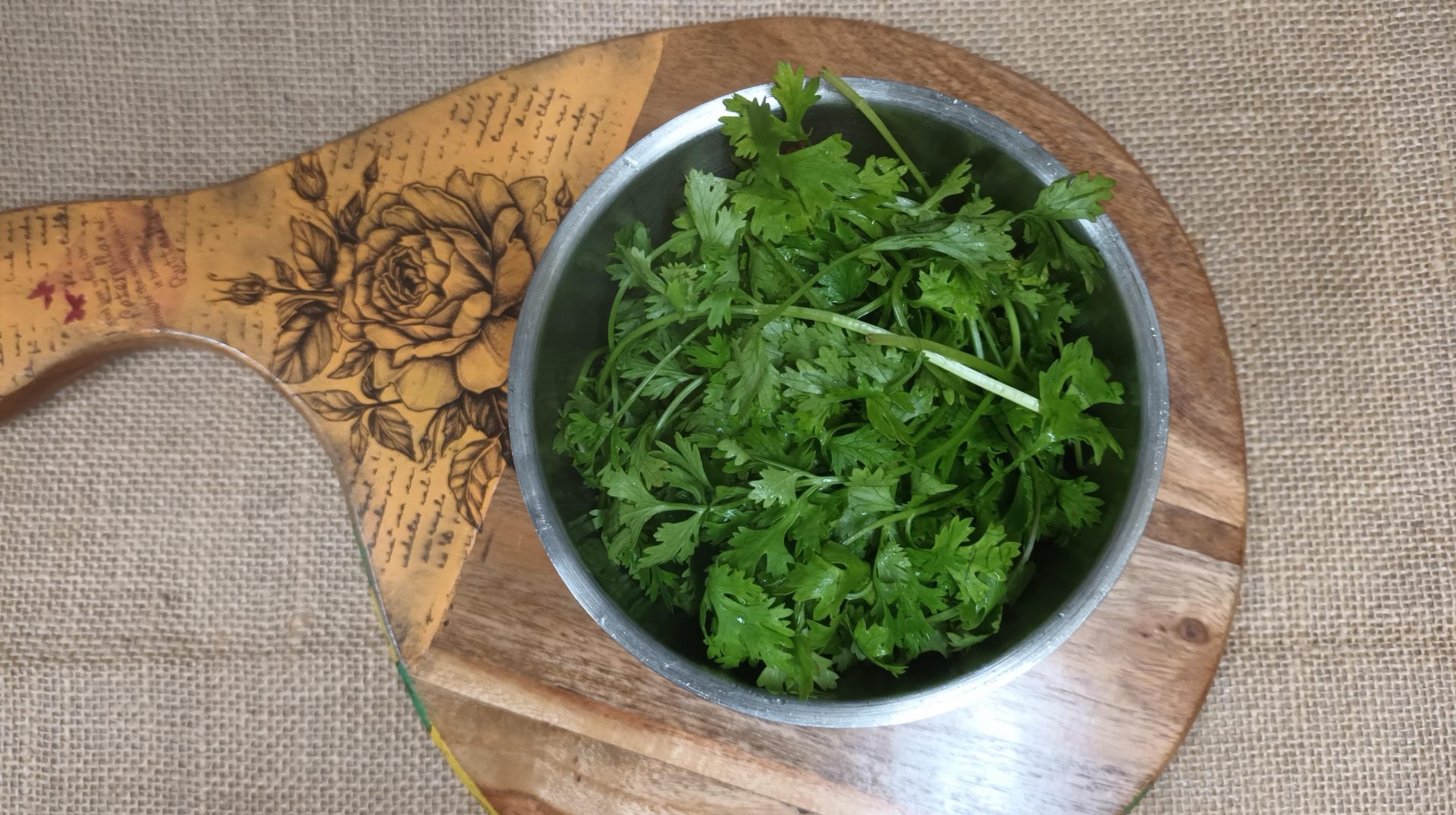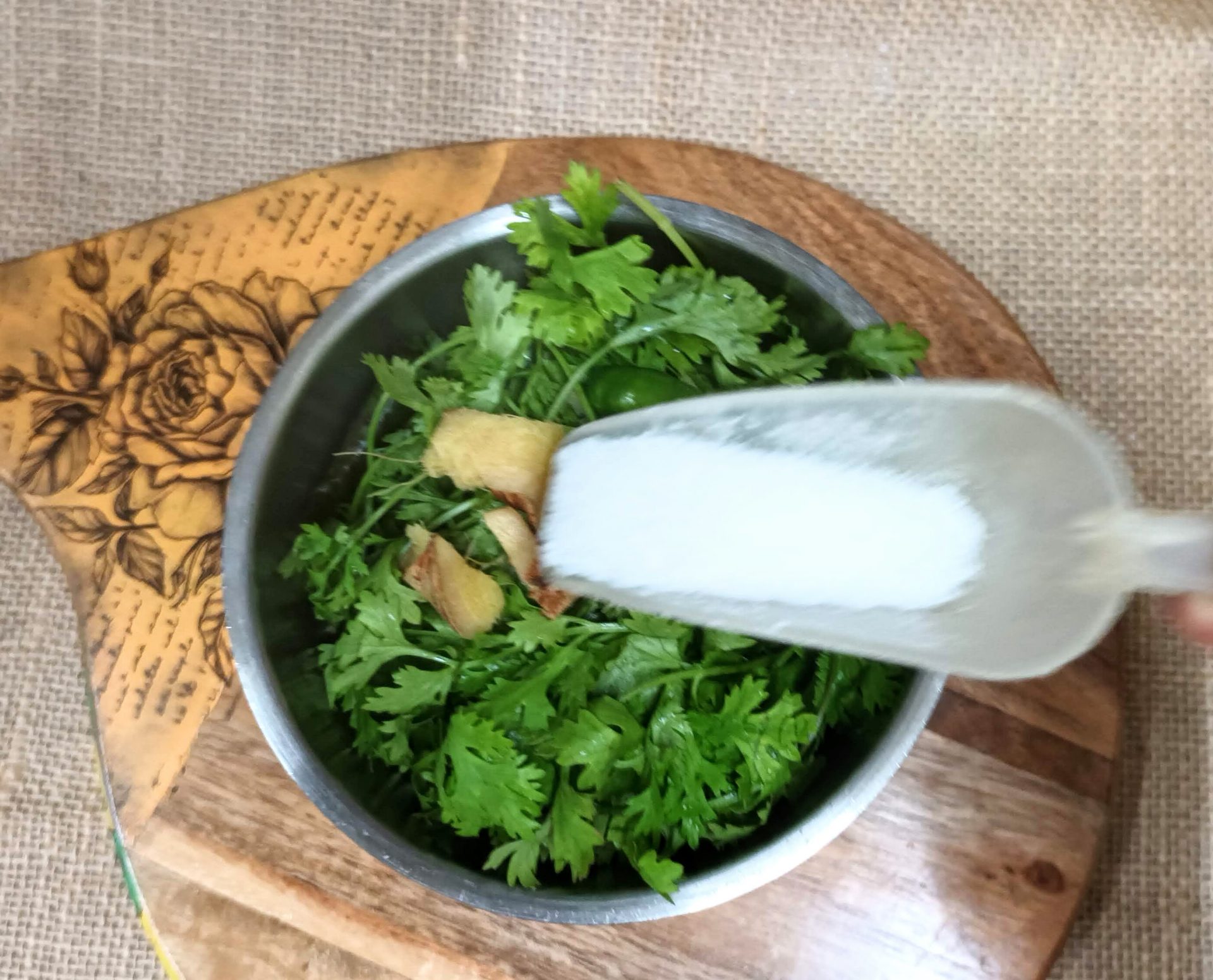 - Fresh Coriander leaves 1/2 a bunch chopped (for dense flavour add up to 200 gm)