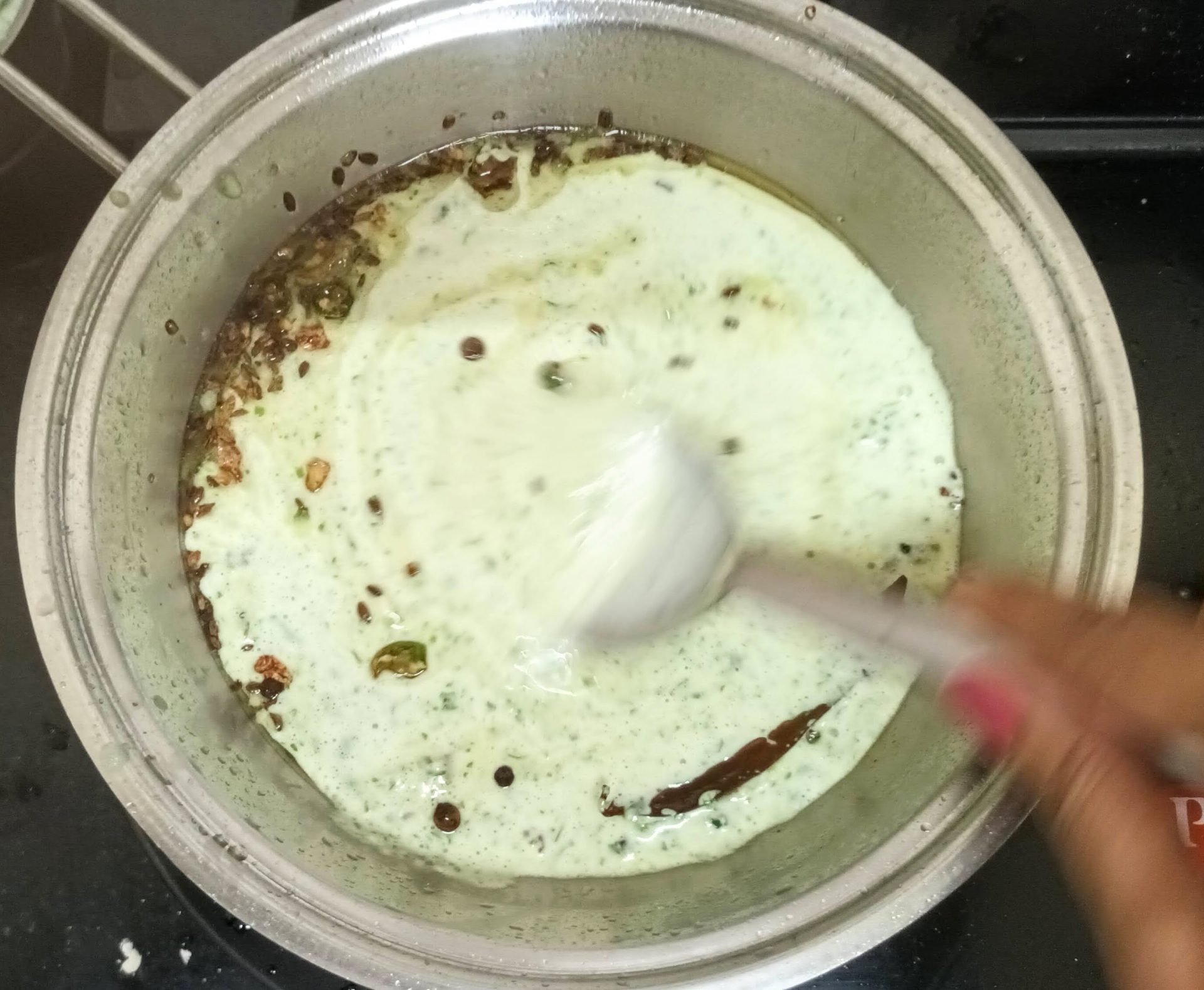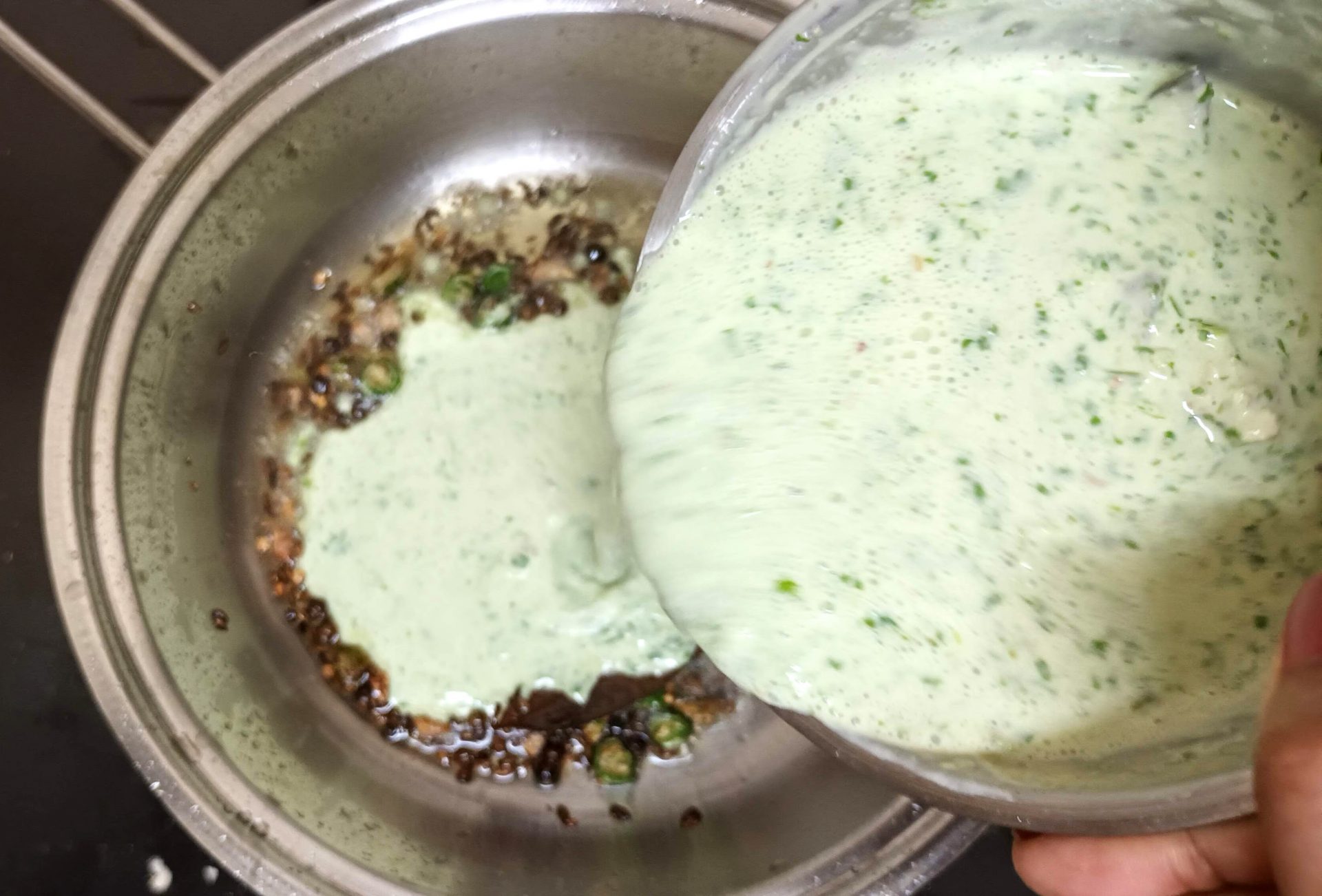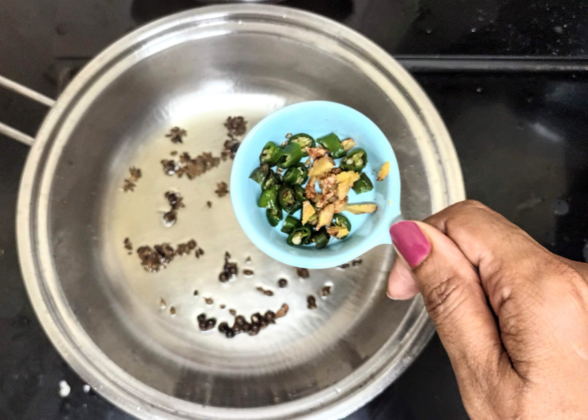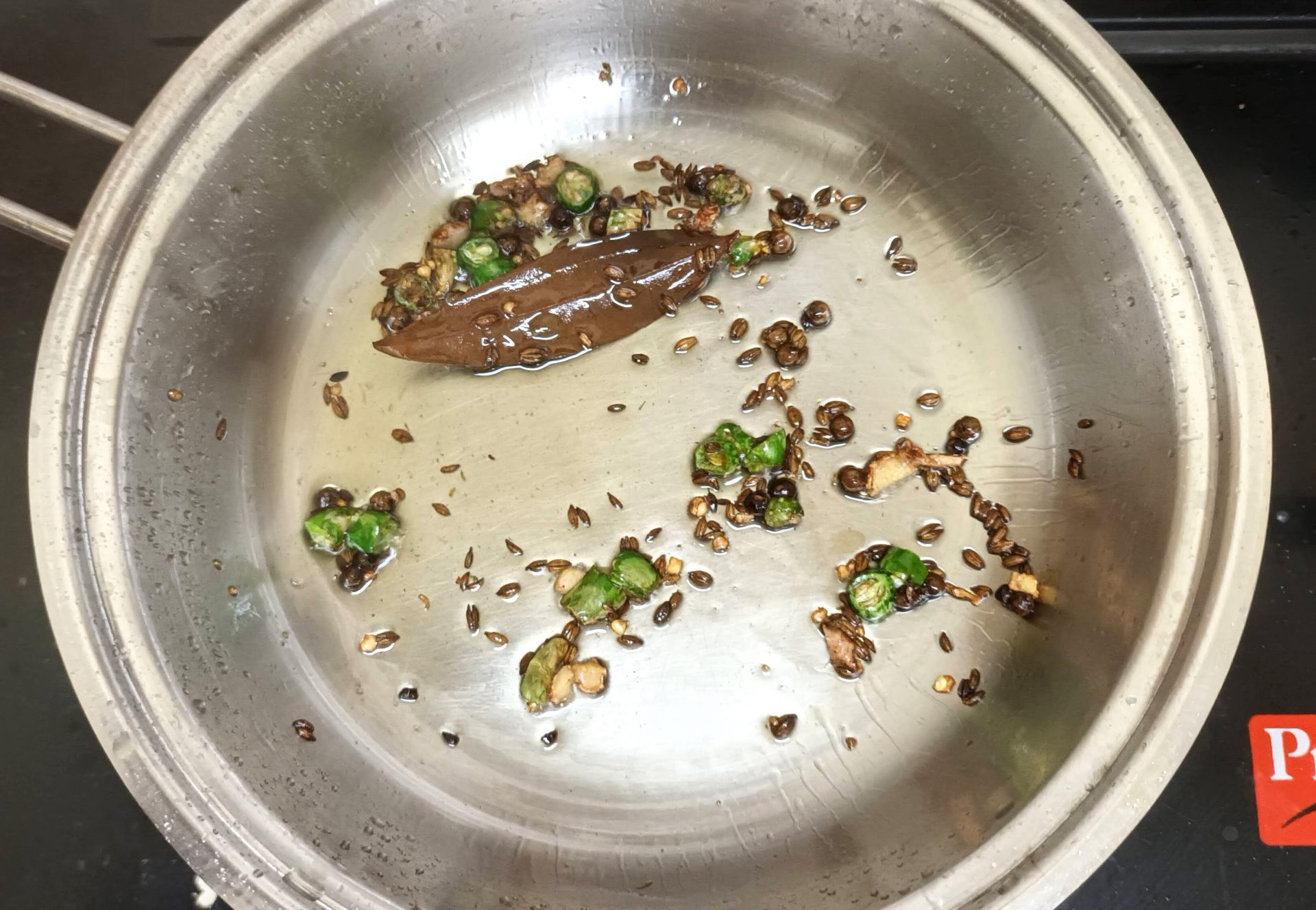 - Now heat oil in a pan and add the Bay leaf, Peppercorns, and cumin seeds. Fry for 30 seconds, and add the chopped green chillies and ginger. Fry another 30 seconds, and pour the blended puree into the tempering. Add 1/4 cup water, and keep stirring over a low flame until the gravy begins to thicken.