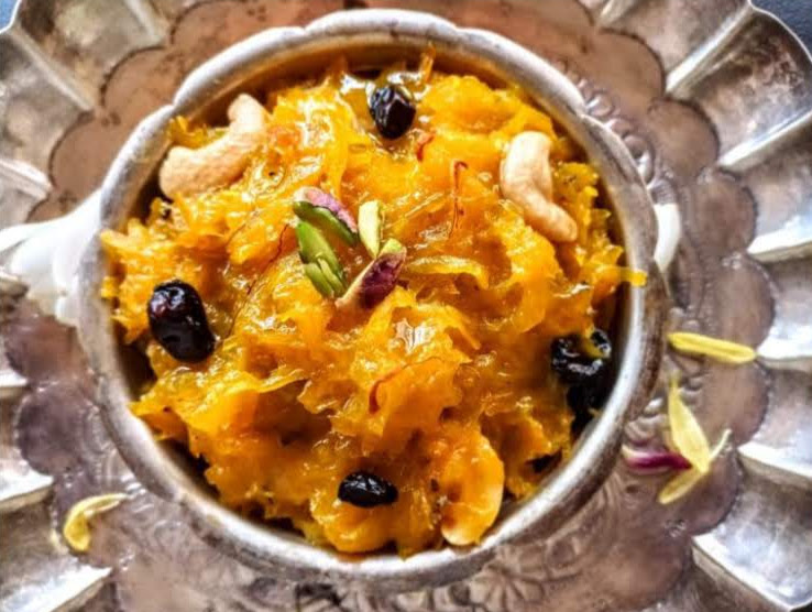 This Indian sweet is so close to my heart as they bring back many memories of places, people and a different time altogether. Kajjikayalu in Telugu means Karanji or Gujiya.Kova Kajjikayalu or Kobbari Kova Kajjikayalu is a melt in the mouth sweet with a stuffing of coconut and jaggery, covered on the outside with sweetened Kova or Mava. This is a very easy to do recipe.For the recipe click here. - Pumpkin Halwa: