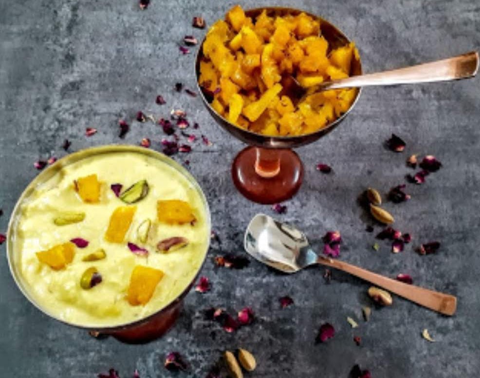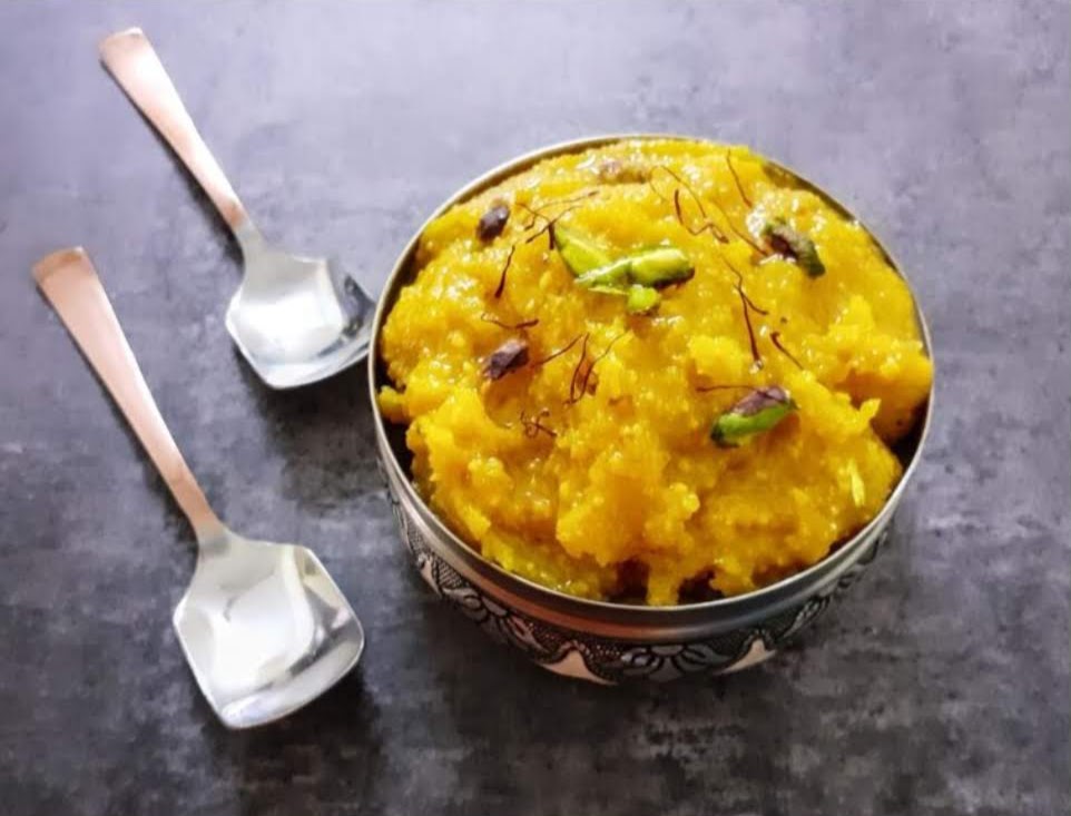 Rabri is a sweet-dish made by boiling and reducing milk until it gets a thready texture and becomes dense. It is flavoured with cardamom and nuts and served chilled.I love making fruity desserts, and I have noticed that my guests always veer towards fruity desserts. I have been making Pineapple Rabri for many years now, and my daughter has always been a huge fan of this dessert. The first dessert I make during Pineapple season is always this one, followed by the Eggless Pineapple cake and then the Pineapple Kesari.For the recipe click here. - Moong Dal Halwa: