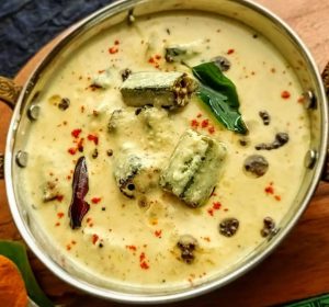 - Mor Kuzhambu (with Okra/Ladysfinger)- This is a popular south Indian dish made with curd/yogurt and is the counterpart of the North Indian Kadi. In the North Indian Kadi chickpea flour or besan is used to give body to the dish, whereas in Mor Kuzhambu Chana dal and Tuvar dal( yellow lentils and gram) along with coconut are used to give body. The masalas used in Kadi are in powdered form, whereas in the South Indian Mor Kuzhambu the whole masalas are ground to a paste. Click here for recipe.