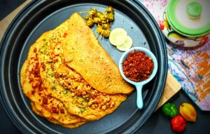 - Zucchini and Potato Wheat Dosa- Wheat Dosa is very common in south Indian homes. Most of the times jaggery is added to it and we call it Vella Dosai, meaning jaggery Dosa or sweet Dosa. The Dosa is healthy as it is made of wheat, I have included vegetables and the best part, because of all these reasons it could be served as breakfast, lunch or dinner. The vegetables used here are entirely customizable, but I would recommend adding a small potato, as I found it gives a good texture and softness to the Dosa. This dish is wholesome, no mess and quick fix. For recipe click here.
