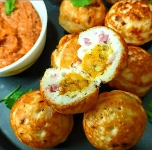 - Kuzhi Paniyarams are basically Lentil and rice batter dumplings. The batter is fermented and then poured into a Paniyaram pan which gives them the shape. Most often in South Indian homes the Kuzhi Paniyaram is made from the Idli batter itself. When the batter becomes a little sour it is made into Paniyaram. I have stuffed the Paniyaram with a mashed potato spicy stuffing which tastes wonderful, (Onions that I have added to the batter are optional. While making them on Puja days, I avoid using onion), other than that green chillies, ginger and curry leaves can be added to the batter. Click here for recipe.