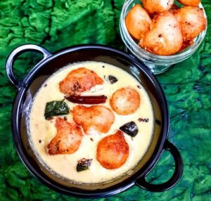 - Bonda Mor Kuzhambu- This is another version of Mor Kuzhmbu/ Kadi, wheere in place of vegetables, fried lentil dumplings are added. Usually, Urad dal/ Black lentils are soaked and ground to a fine batter and then deep-fried in oil. There is a popular south Indian snack called Mysore Bonda, so these Bondas are put in the Kadi. I make this in a much simpler fashion though. Idli/Dosa batter is a staple in all our homes, I have used that to make the Bondas with a little additional flours. Checkout the recipe here.