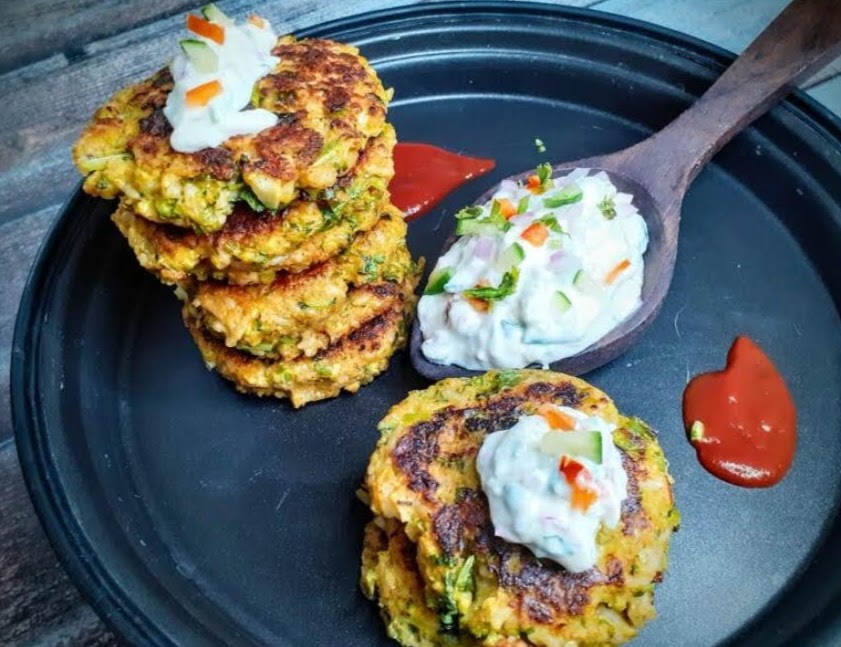 - Broccoli And Zucchini Fritters- The combination of Zucchini and Broccoli is a match made in heaven. These two have been used in many dishes from Pastas, Pizzas, Salads and fritters. The current recipe is of fritters, which are very melt in the mouth and bursting with flavours. Usually fritters have egg added to the batter, but these are eggless fritters. They need not be deep fried at all, but just grilled on the Tava, which makes them healthy too. I had some leftover rice and added it to the batter to make them chunky and give a slightly crisp exterior, whereas the insides are soft. I have used onion in the hung curd dip, which can be avoided while making as a Satvik meal. Click here for recipe.