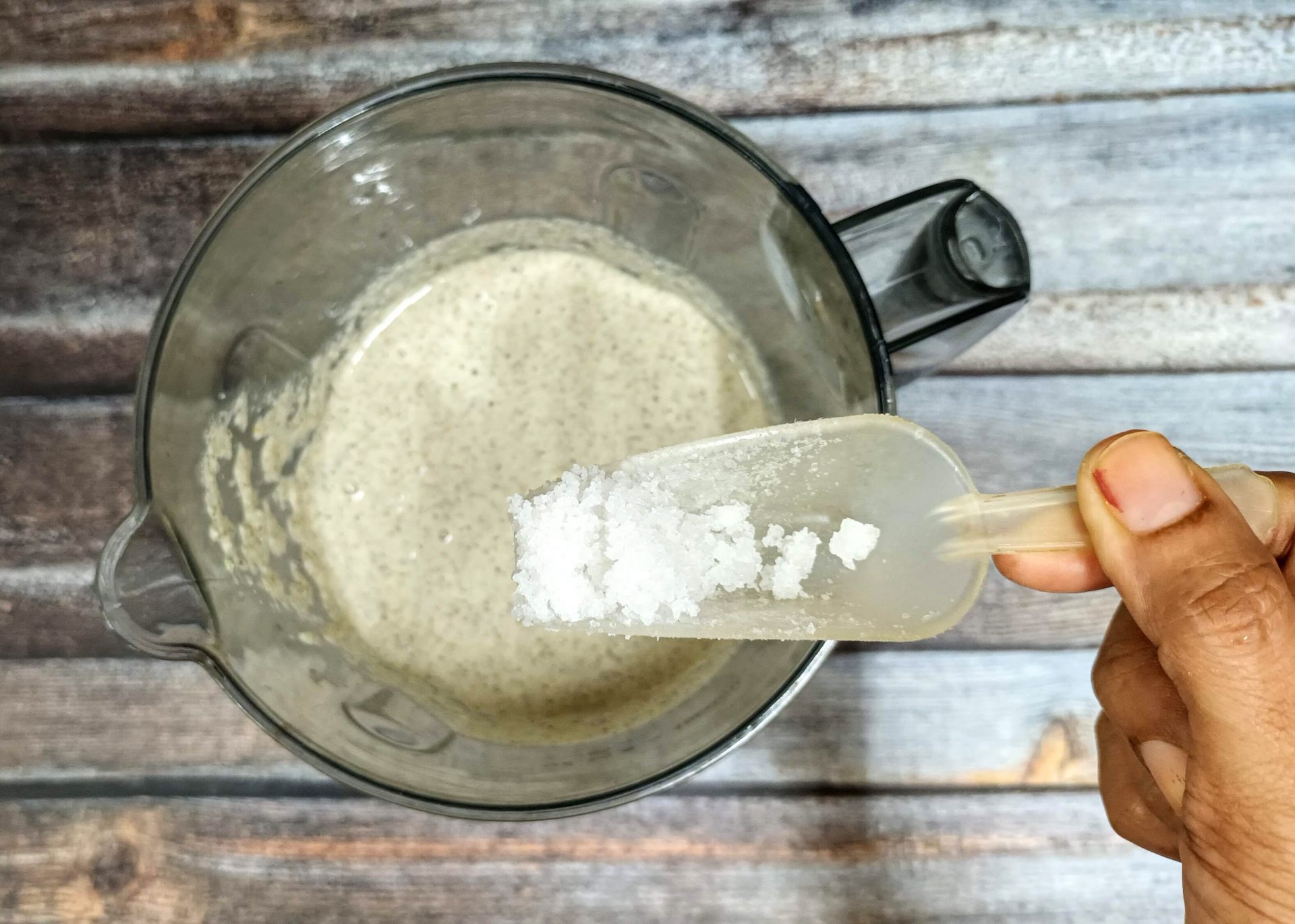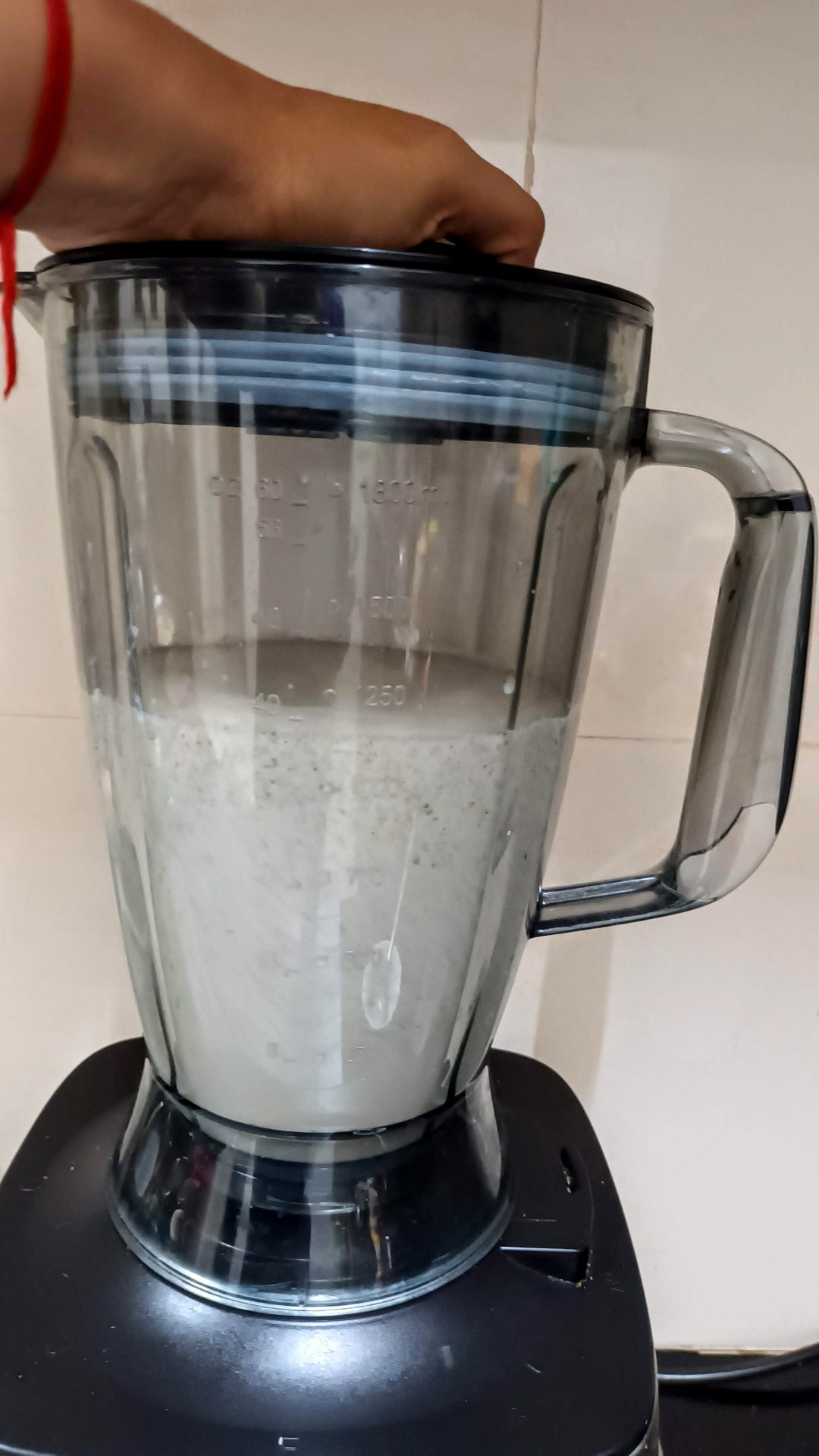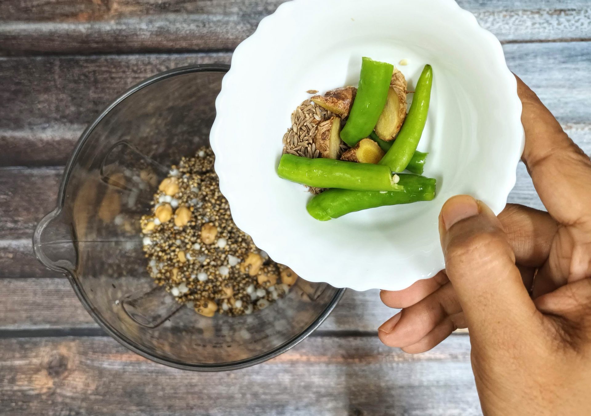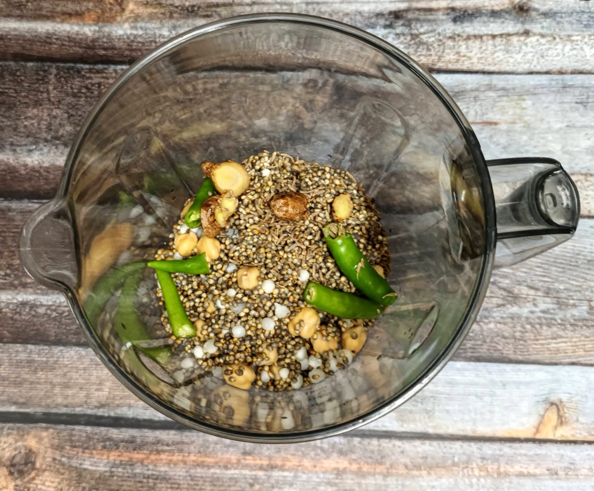 - Now drain all the water, and transfer the soaked ingredients into a blender jar. Add the Cumin seeds, green chillies, ginger, adequate water and grind to form a smooth free flowing batter. Add salt, and give it another spin in the blender to evenly distribute the salt.
