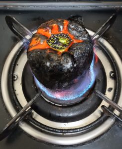 - Wash and dry a medium to big sized Red Bell Pepper. Brush oil over it, and put it on the flame to Char/ Roast it. When fully black, transfer to a bowl of water to cool it. Once cool, remove the charred skin and chop into small pieces. Discard the seeds.