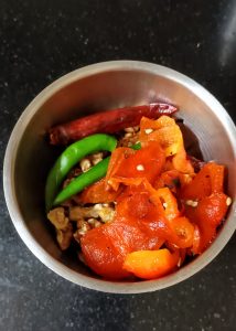 Wash and dry a medium to big sized Red Bell Pepper. Brush oil over it, and put it on the flame to Char/ Roast it. When fully black, transfer to a bowl of water to cool it. Once cool, remove the charred skin and chop into small pieces. Discard the seeds. In a blender jar take the Walnuts, green chillies, dry Red chillies, salt and the chopped roasted Bell Peppers, and blend them. Add water and blend to a fine paste. Now add Red chilli powder, Kashmiri red chilli powder, and lemon juice and mix. ( skip adding Red chilli powder if sensitive to heat). Finally, take oil in a tempering pan. Add mustard seeds, and when they crackle, add the curry leaves and the broken dry Red chilli pieces. Drop the tempering into the chutney and serve.