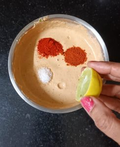 - Now add Red chilli powder, Kashmiri red chilli powder, and lemon juice and mix. ( skip adding Red chilli powder if sensitive to heat).