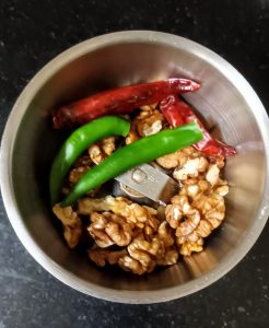 - In a blender jar take the Walnuts, green chillies, dry Red chillies, salt and the chopped roasted Bell Peppers, abd blend them. Add water and blend to a fine paste.