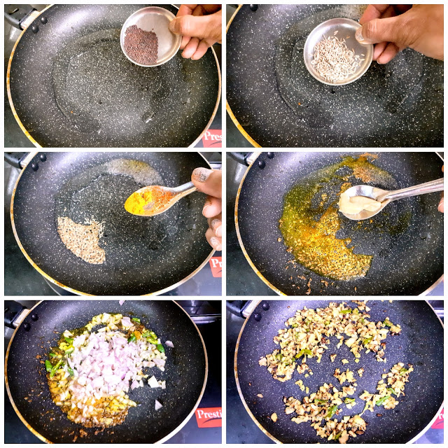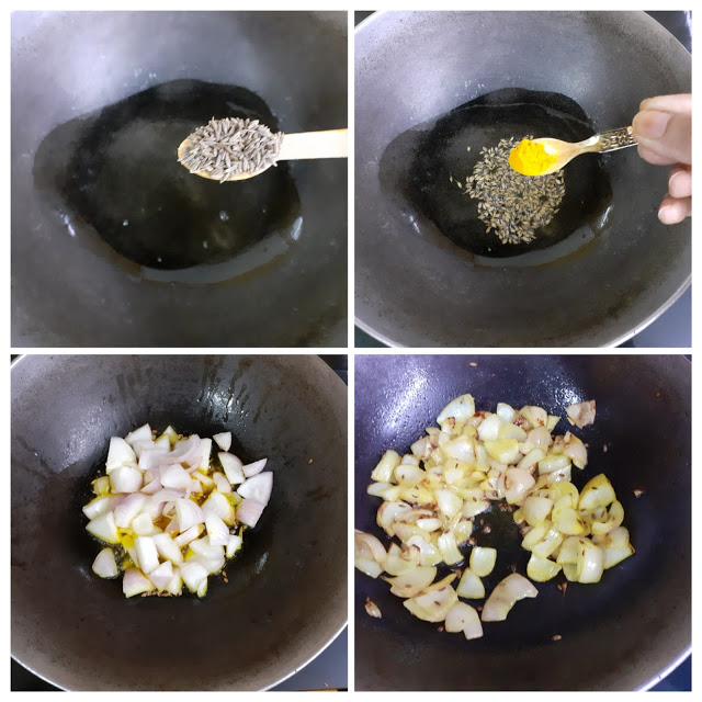 5. Now add the turmeric powder followed by chopped onions and saute until the onions start turning brown.