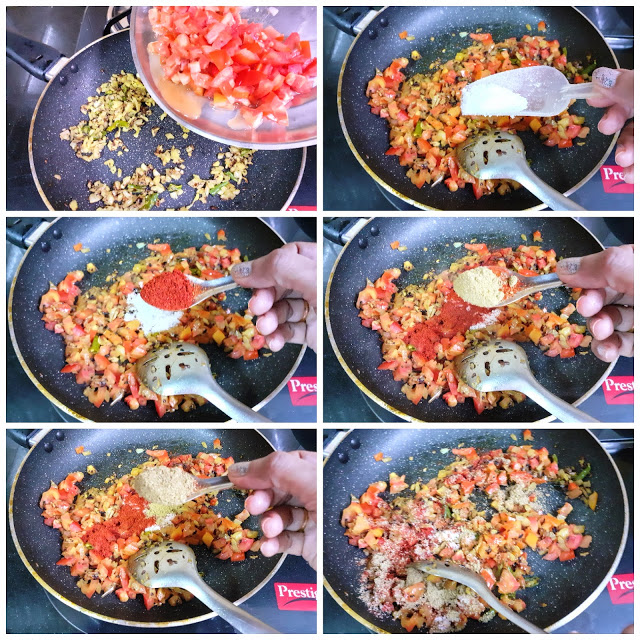 6. Now add the tomatoes and saute for a minute. Add the salt and continue to cook for a minute. Keep mashing the tomatoes as you cook. Now add the red chilli powder, followed by coriander powder and fennel powder and cook until the tomatoes turn mushy and the mixture looks like a paste.
